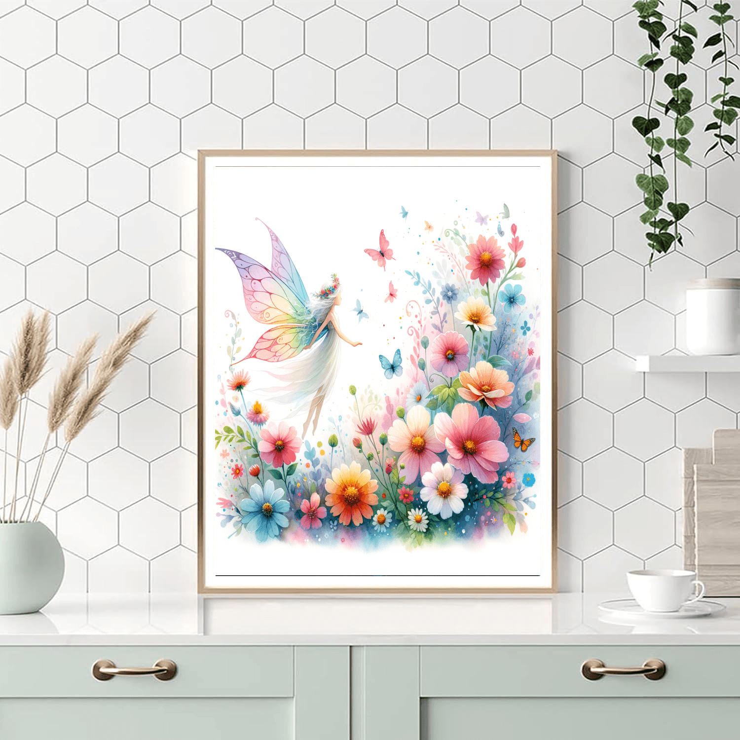 Let your childs imagination soar with our Fluttering Fairy artwork. This magical piece features a delicate fairy with gossamer wings surrounded by a flurry of flowers and butterflies. Its perfect for encouraging creativity and a love for nature, while the simple design makes it easy for kids to complete and hang in their room or gift to a friend. The fairy theme is beloved by many and adds a magical touch to any space.