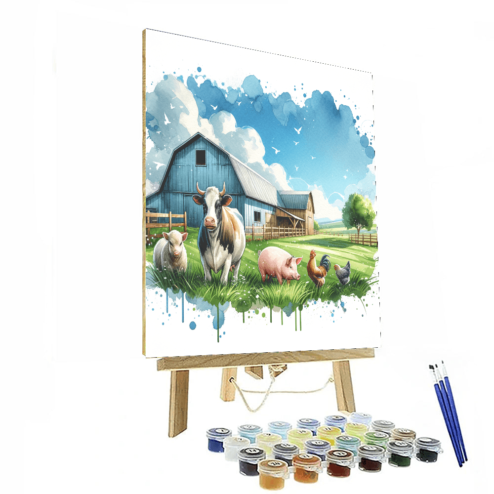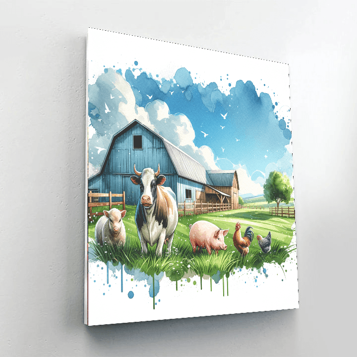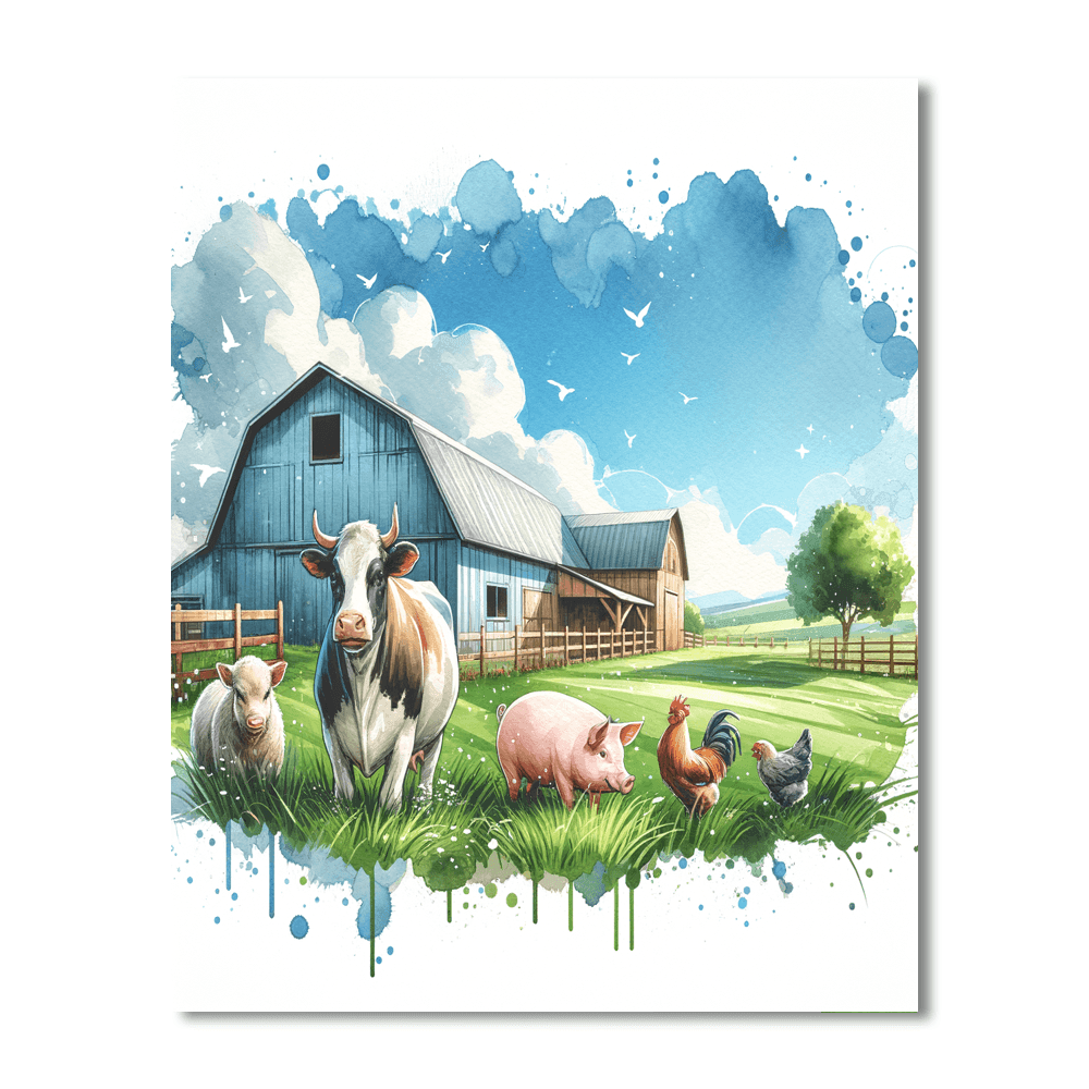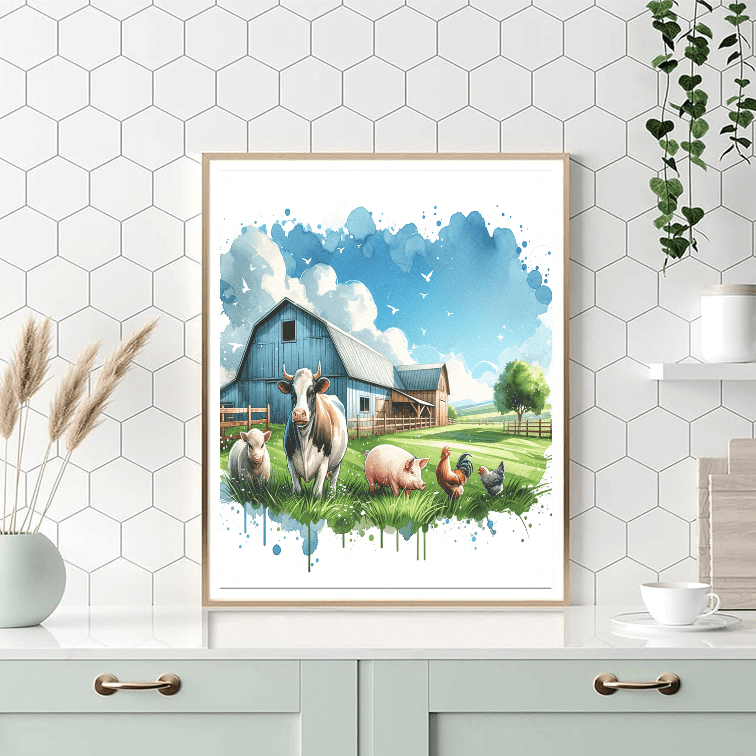 A delightful scene of a farm with a variety of friendly animals, including a cow, pig, and chicken. Perfect for creating a cozy atmosphere in a childs bedroom or playroom.