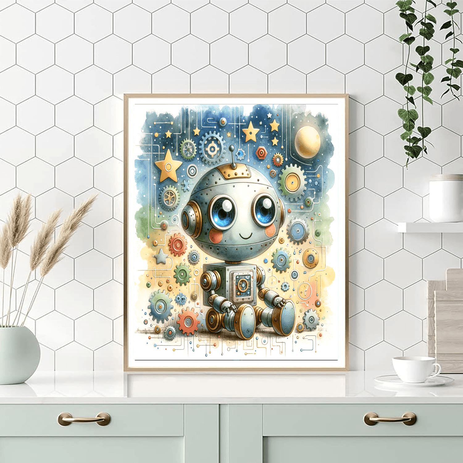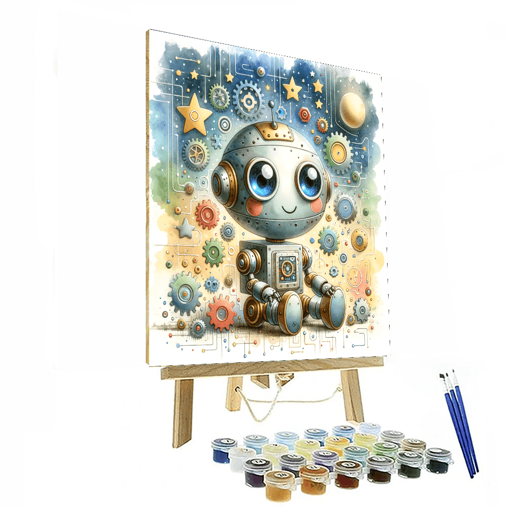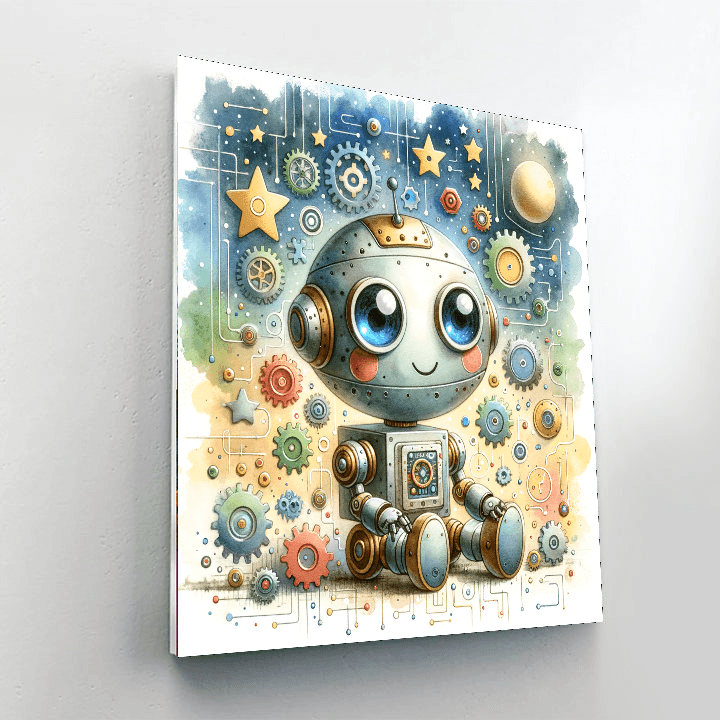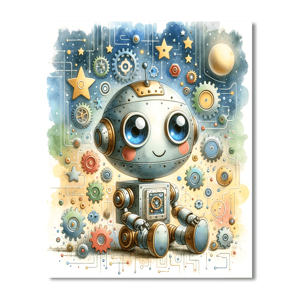 The Friendly Robot product introduces children aged 7-12 to the world of technology and imagination. This fun kit features a cute robot with big expressive eyes and colorful buttons, surrounded by gears and stars. Kids will enjoy coloring this delightful character while learning about robotics and creativity. Perfect for use in playrooms, bedrooms, or even tech-themed classrooms, this product fosters a love for innovation and creative thinking.