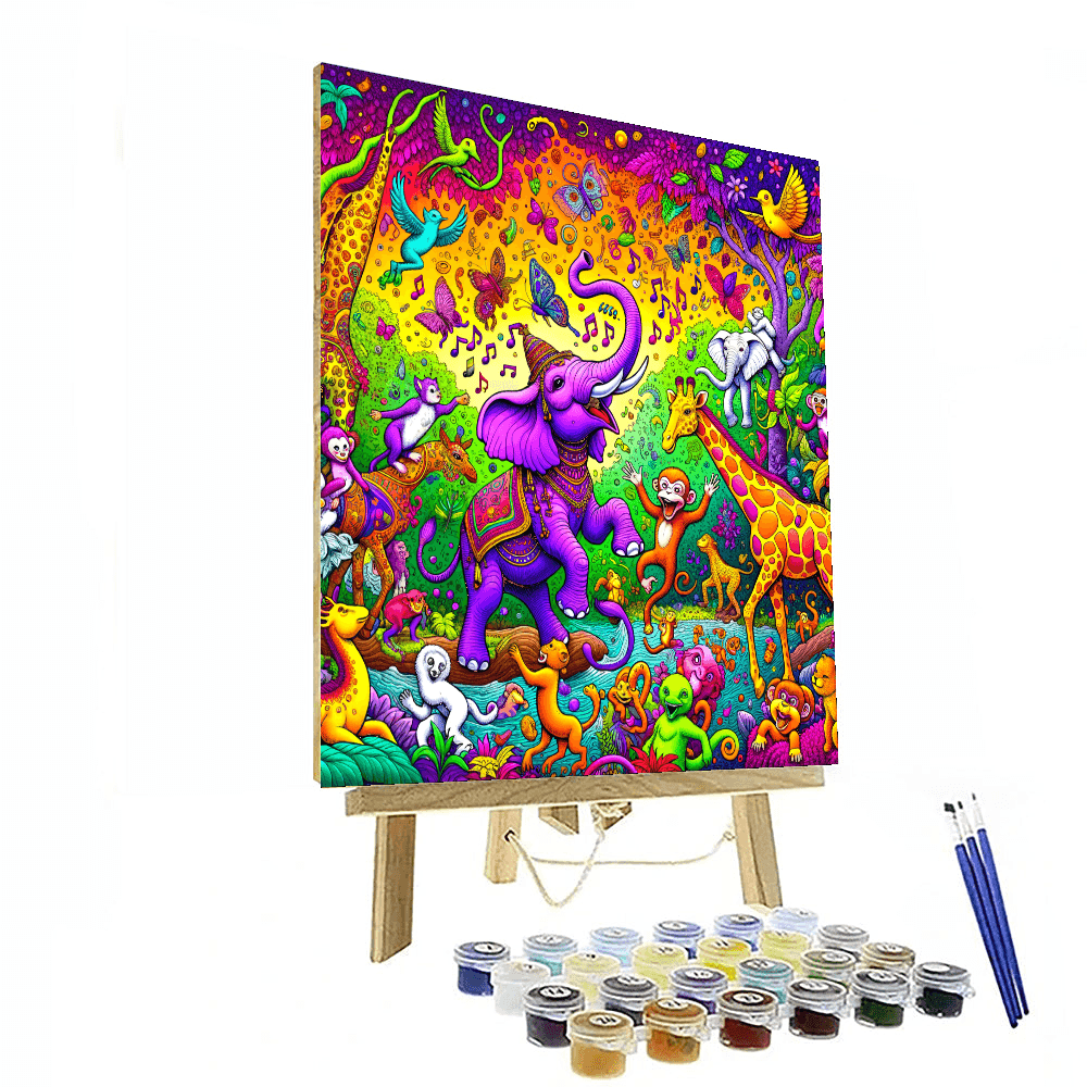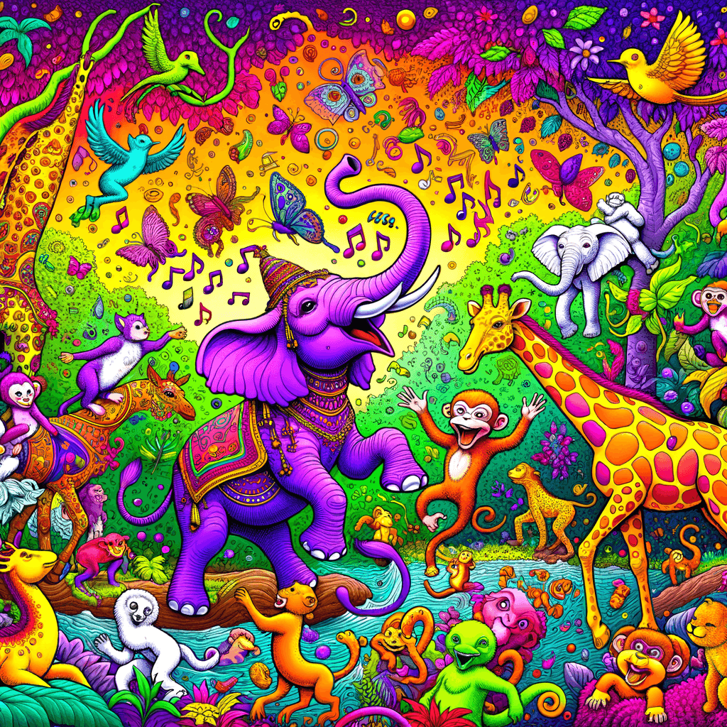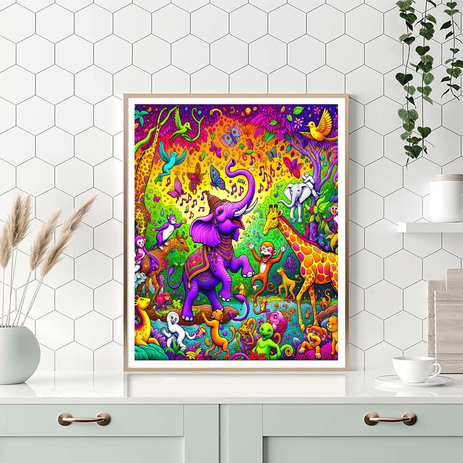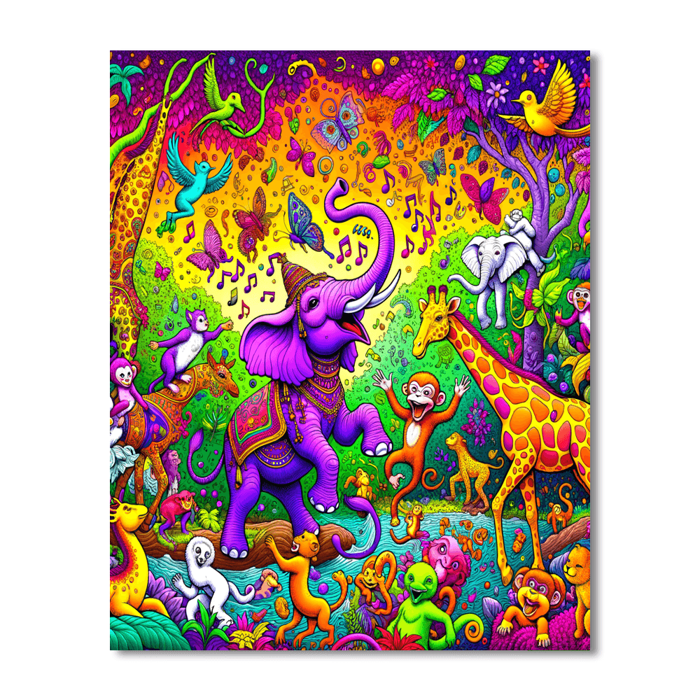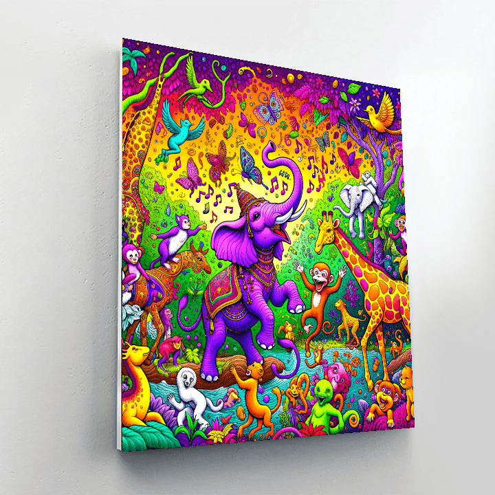 Add a playful touch to your decor with this fun and funky depiction of animals. Featuring a variety of whimsical creatures in vibrant colors and quirky poses, this artwork brings joy and laughter to any space. Perfect for a childs bedroom or playroom, it sparks creativity and imagination. The lively colors and playful composition create an inviting atmosphere that encourages fun and exploration. This piece serves as a celebration of the joy of animals and the happiness they bring.