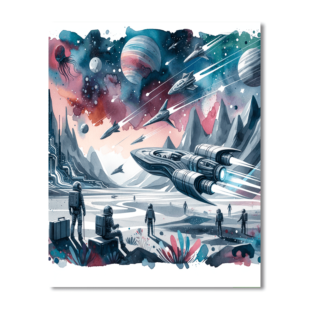 Embark on an epic space adventure with this cosmic painting featuring futuristic spaceships, alien planets, and interstellar explorers. Inspire kids to reach for the stars through art.