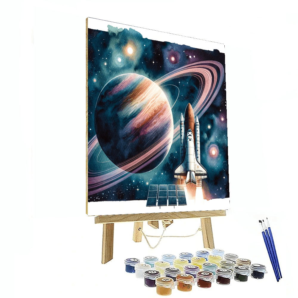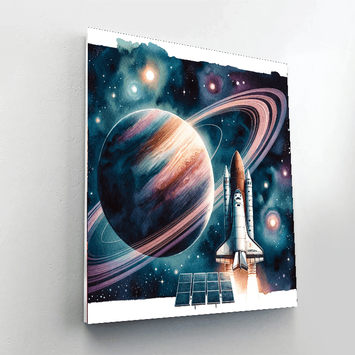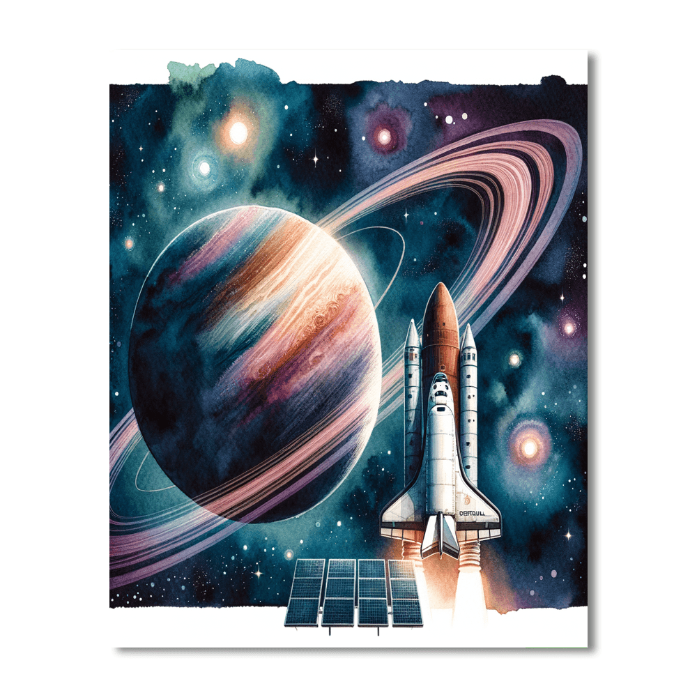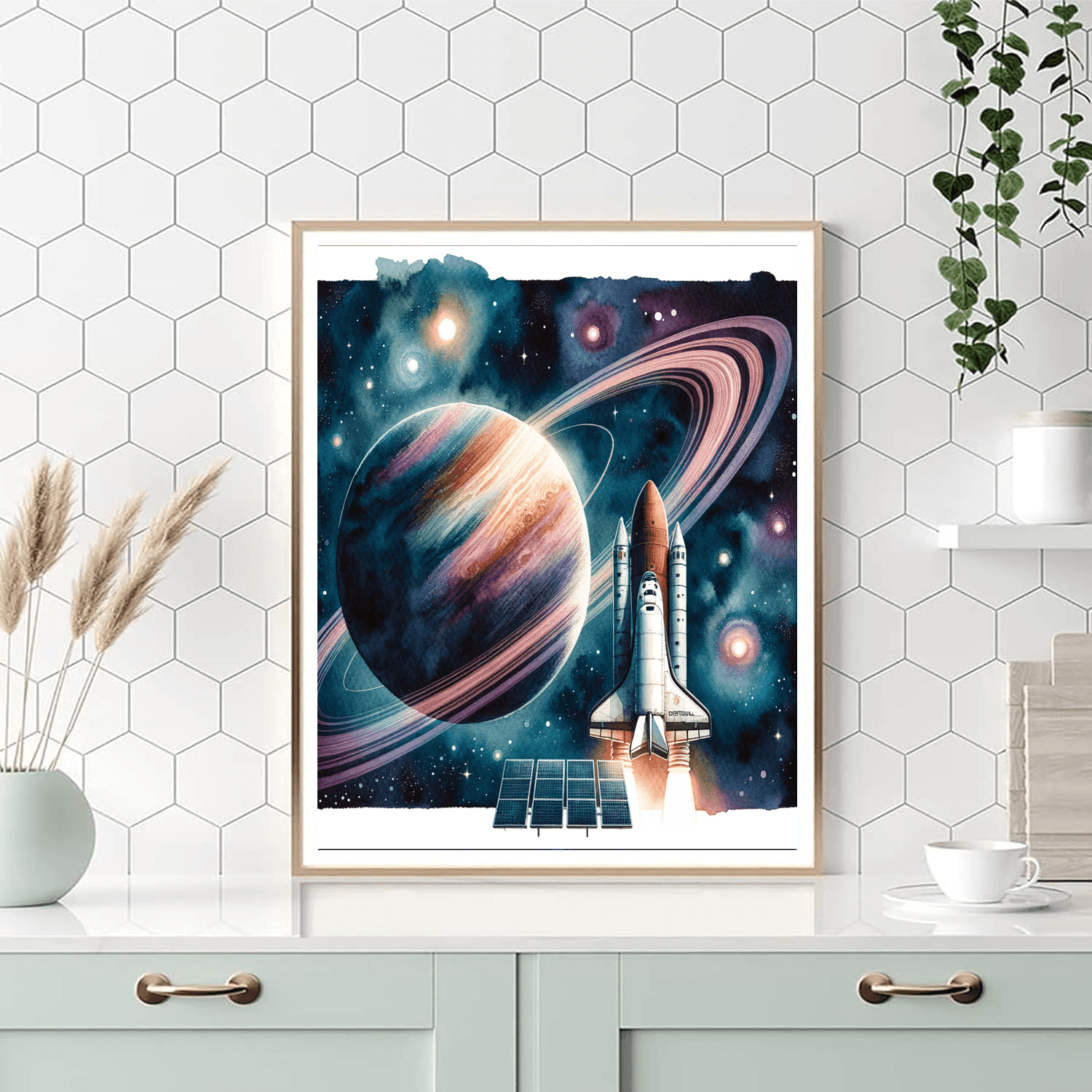 Embark on an interstellar adventure with Galactic Space Explorer! This galactic scene inspires young minds to dream big and learn about astronomy and physics. Featuring a detailed depiction of a space shuttle orbiting a vibrant planet with rings, against a backdrop of a starry sky, its perfect for sparking an interest in science. This product is a fantastic addition to any young space enthusiasts collection, suitable for educational purposes and as a decorative piece in a study area or bedroom, encouraging endless hours of imaginative play and learning.