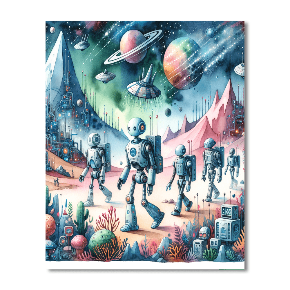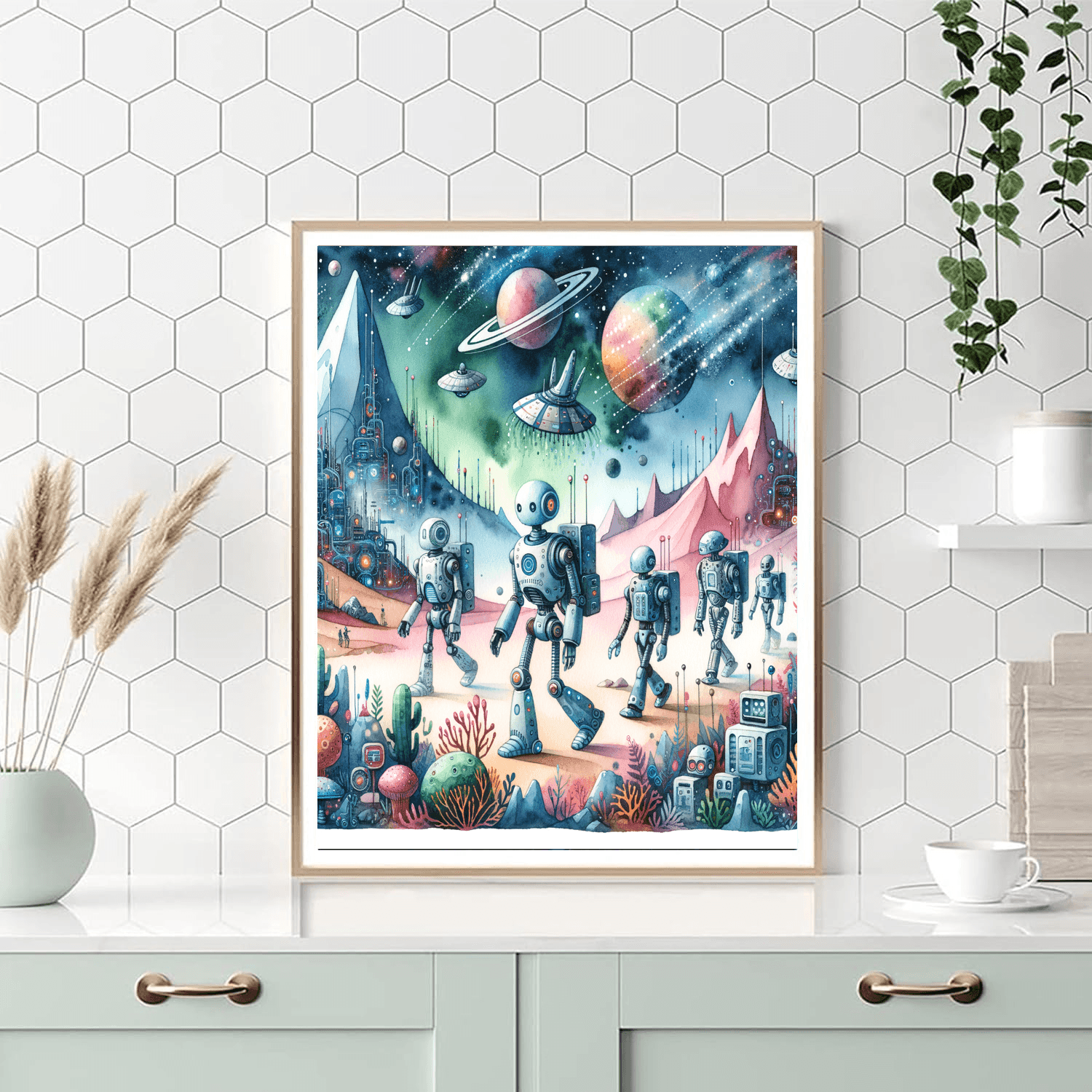 Join the futuristic space robots on an interstellar mission with this sci-fi painting kit. Explore alien planets, cosmic battles, and high-tech robots. Perfect for kids who love robots and space adventures.