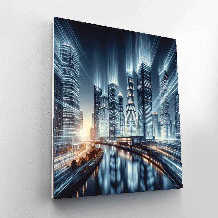 Gleaming Cityscape captures the vibrant energy of a modern city at night, with skyscrapers lit up against the dark sky. This piece is perfect for urban dwellers and those who love the dynamic nature of city life. Ideal for a contemporary living space or office, it brings the excitement and allure of the city into your home. The bright lights and tall buildings create a sense of movement and activity, reflecting the bustling life of the city and providing a glimpse into the urban landscape at night.