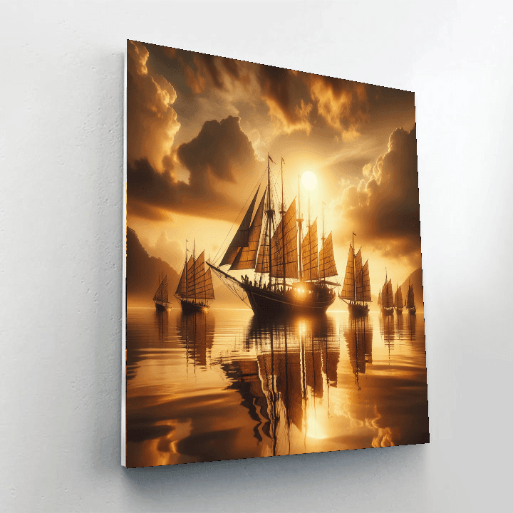 Set sail into the golden hour with Golden Age Sailboats at Sunset. This design features a fleet of vintage sailboats gliding over calm waters as the sun sets, casting a golden glow over the scene. The reflections on the water and the detailed rigging of the sailboats enhance the peaceful yet majestic atmosphere. Ideal for a living room or office, this piece brings a sense of adventure and nostalgia, perfect for those who dream of the sea.