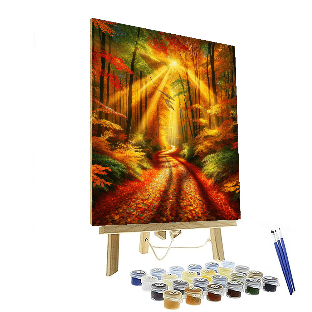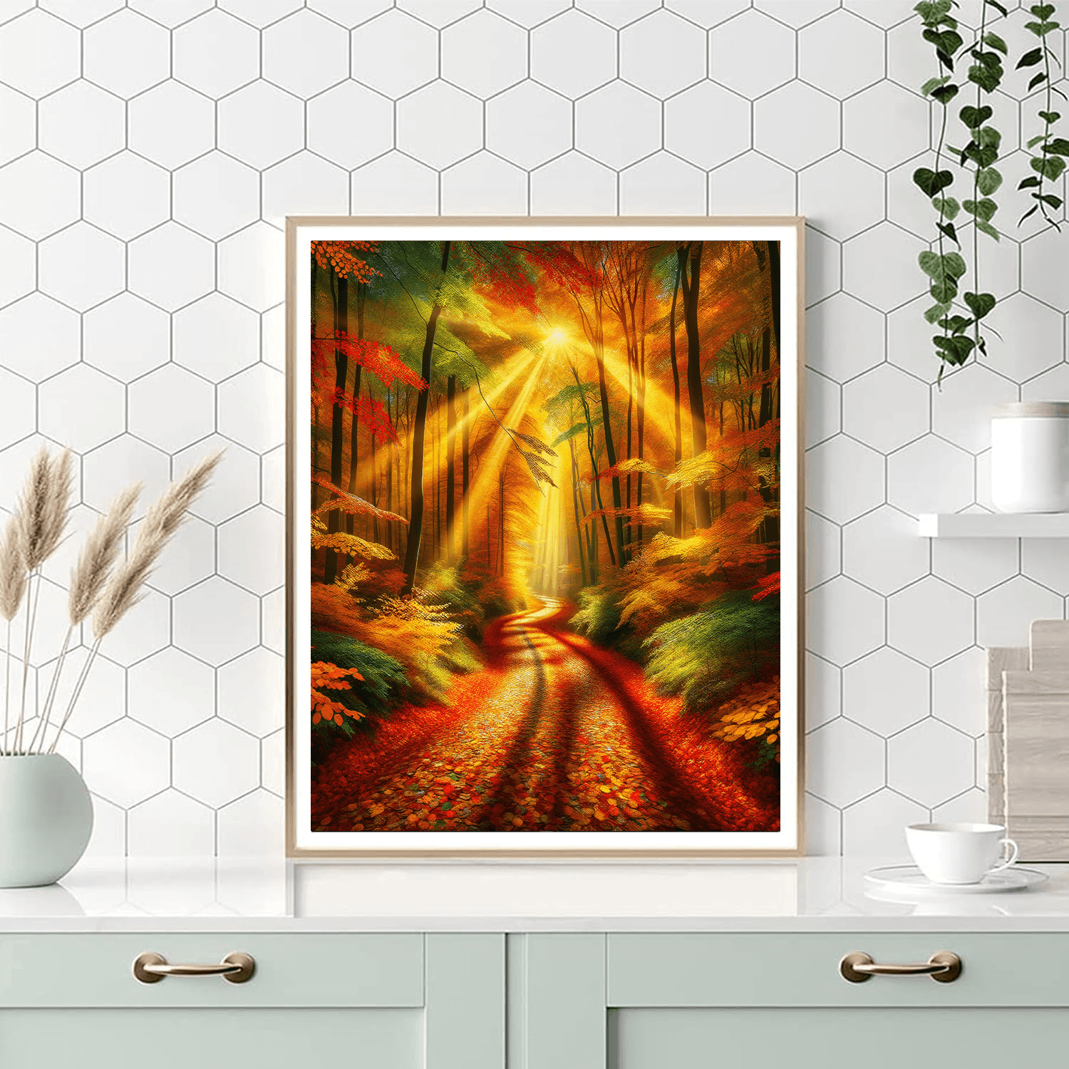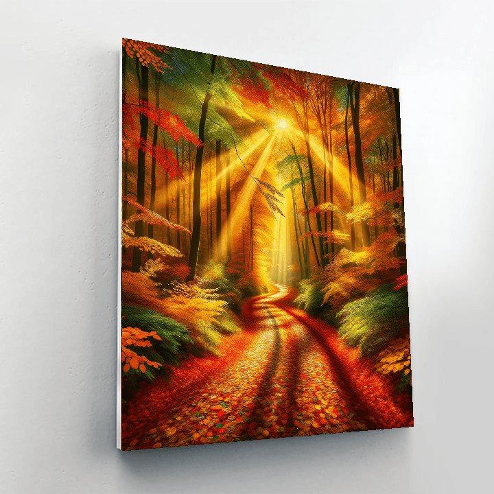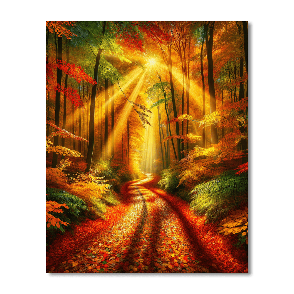 Celebrate the warm, vibrant colors of fall with Golden Autumn Canopy. This piece features a forest path covered by a canopy of autumn leaves in shades of gold, orange, and red. The sun peeks through the foliage, casting dappled light on the path below, inviting the viewer to walk into this warm, inviting scene. Perfect for any space that could use a touch of autumns warmth, especially living rooms or entryways.