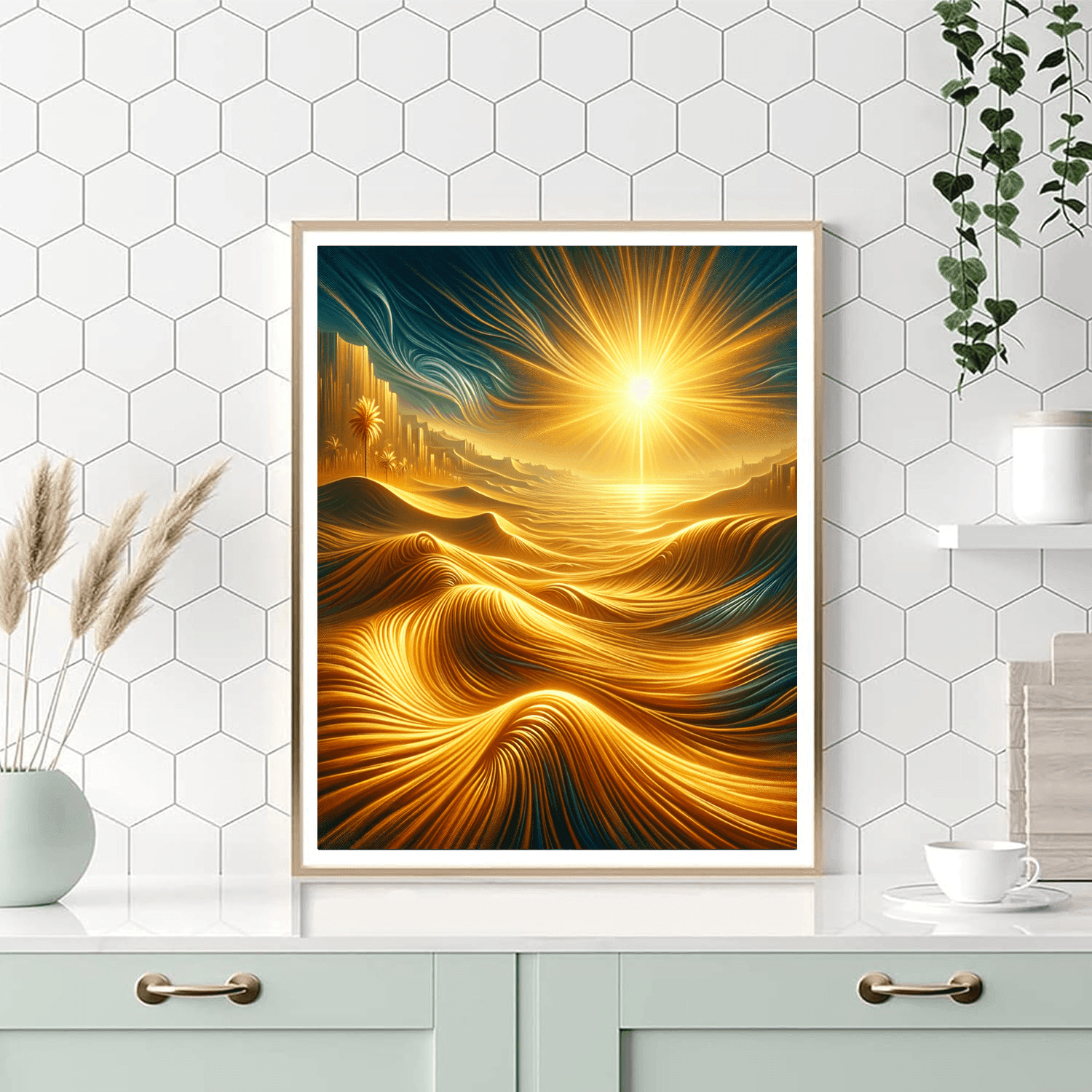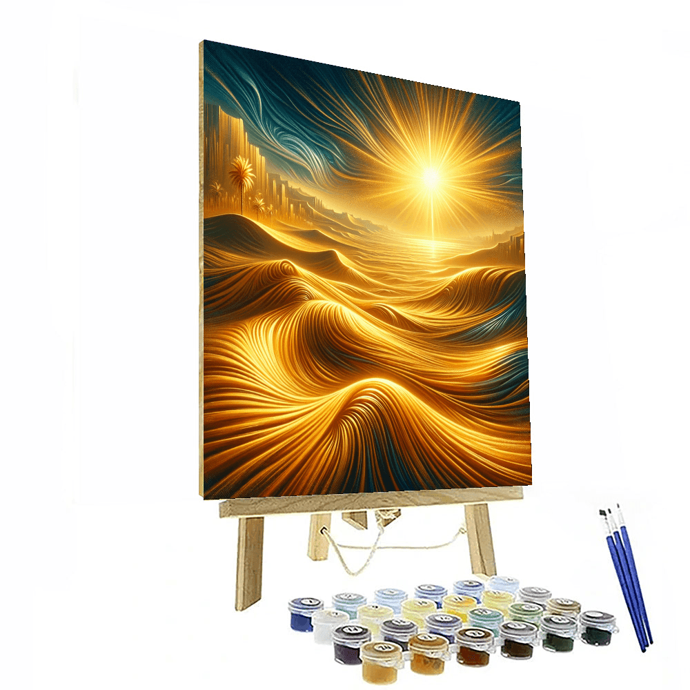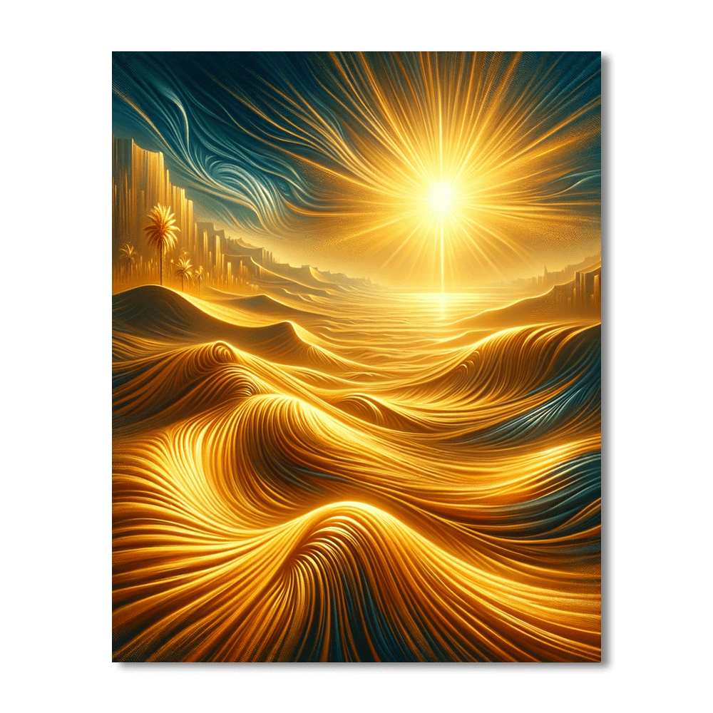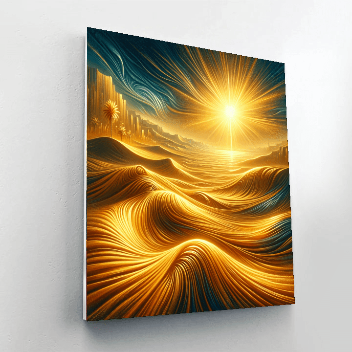 Witness the allure of the Golden Desert Mirage with this captivating painting that captures the mystique of a desert landscape. The golden sands stretch endlessly under the blazing sun, creating a mirage of shimmering heat. The distant dunes and palm trees add to the exotic charm of the scene. Perfect for adding a touch of desert enchantment to your study or home office.