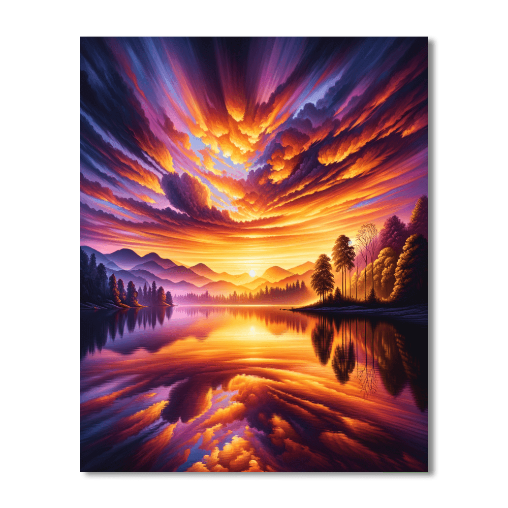 A stunning scene of a golden sunset over a tranquil lake, ideal for creating a calming atmosphere in a living room or bedroom.