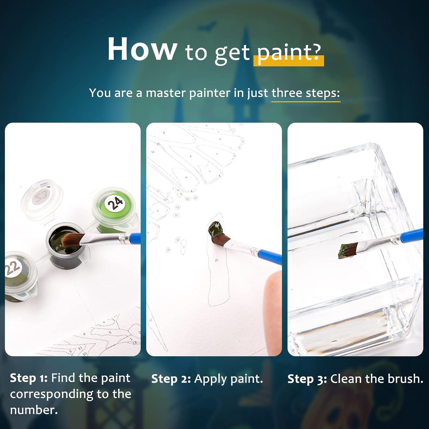 This Beginner Halloween painting kit is designed to be simple yet rewarding. Each section of the canvas is numbered, and each number corresponds to a paint color. Just match, fill, and progress through the design.