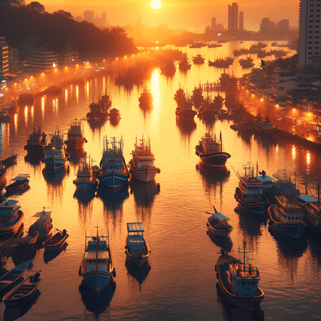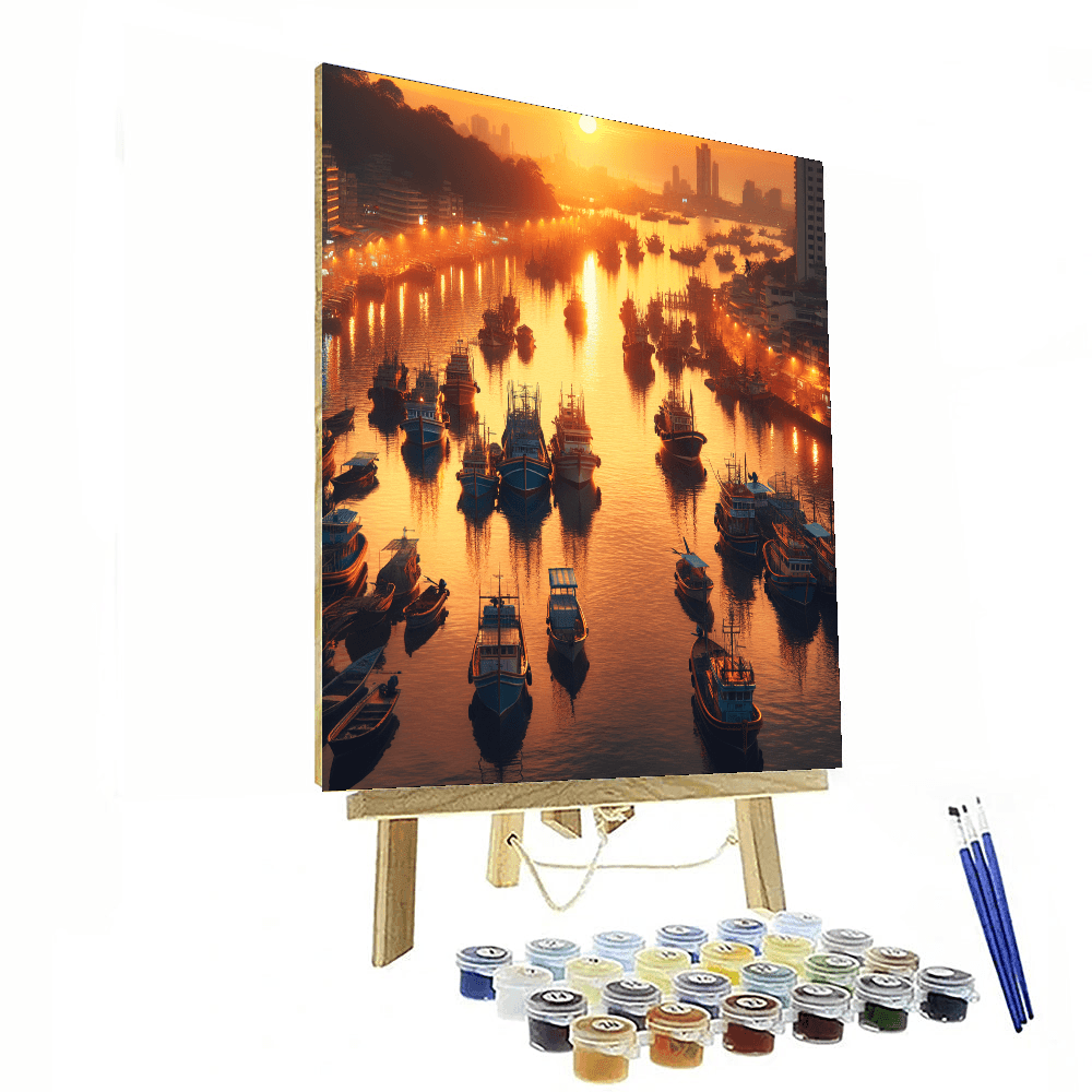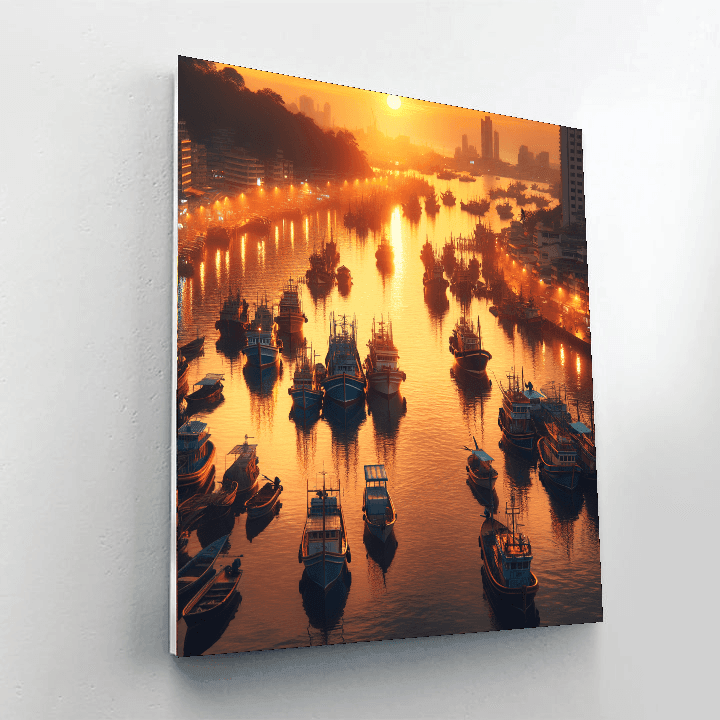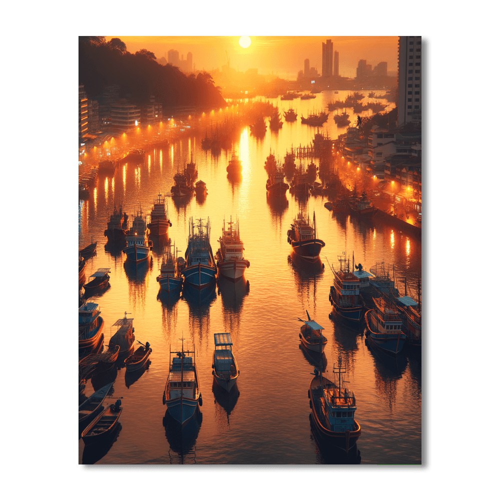 Harbor Lights depicts a bustling harbor at twilight, with boats gently bobbing on the water as the setting sun casts a golden glow over the scene. The reflections of the boats lights in the water add a magical, shimmering effect. This piece is perfect for adding a sense of peace and activity to any space, ideal for a living room or a hallway, where it can remind viewers of the beauty and calm of coastal life.