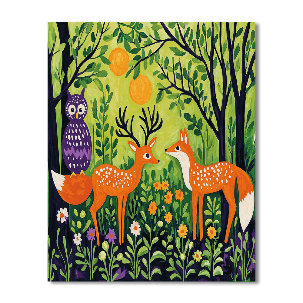 Delight in the enchanting charm of mystical woodland creatures with this whimsical artwork. The painting features a variety of animals in a magical forest setting, making it perfect for a childs bedroom or playroom. The imaginative composition and cheerful colors spark joy and creativity.