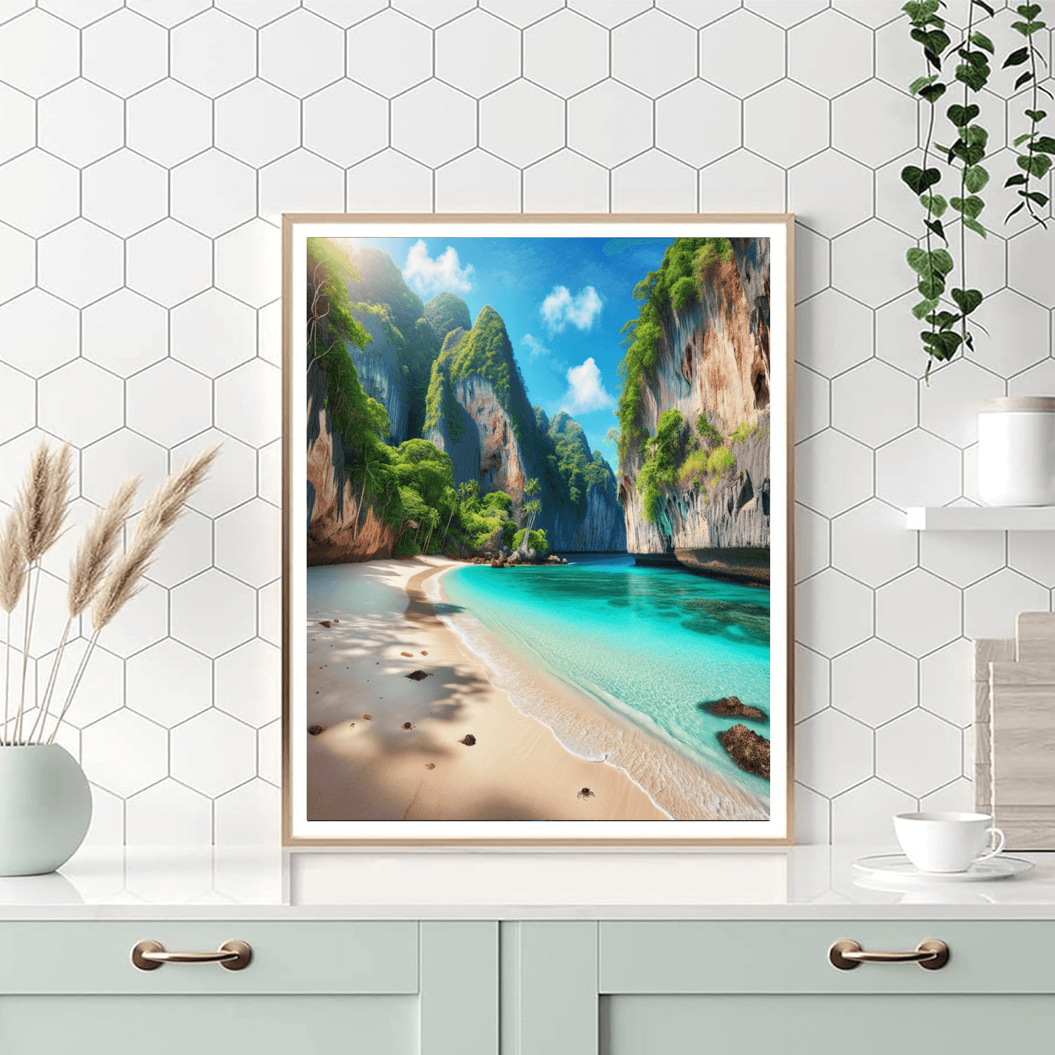 Hidden Cove Paradise offers a glimpse into a secluded beach scene, surrounded by high cliffs and lush tropical foliage. The turquoise waters gently lap against the white sandy beach, creating a peaceful and private paradise. This artwork is perfect for those who dream of tropical escapes and serene beach views, ideal for enhancing the ambiance of a bathroom or a sunroom with its soothing and refreshing visuals.