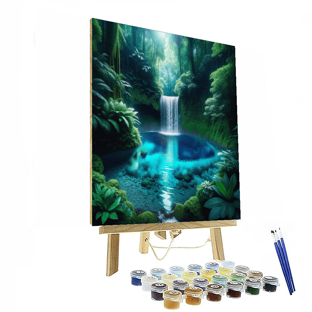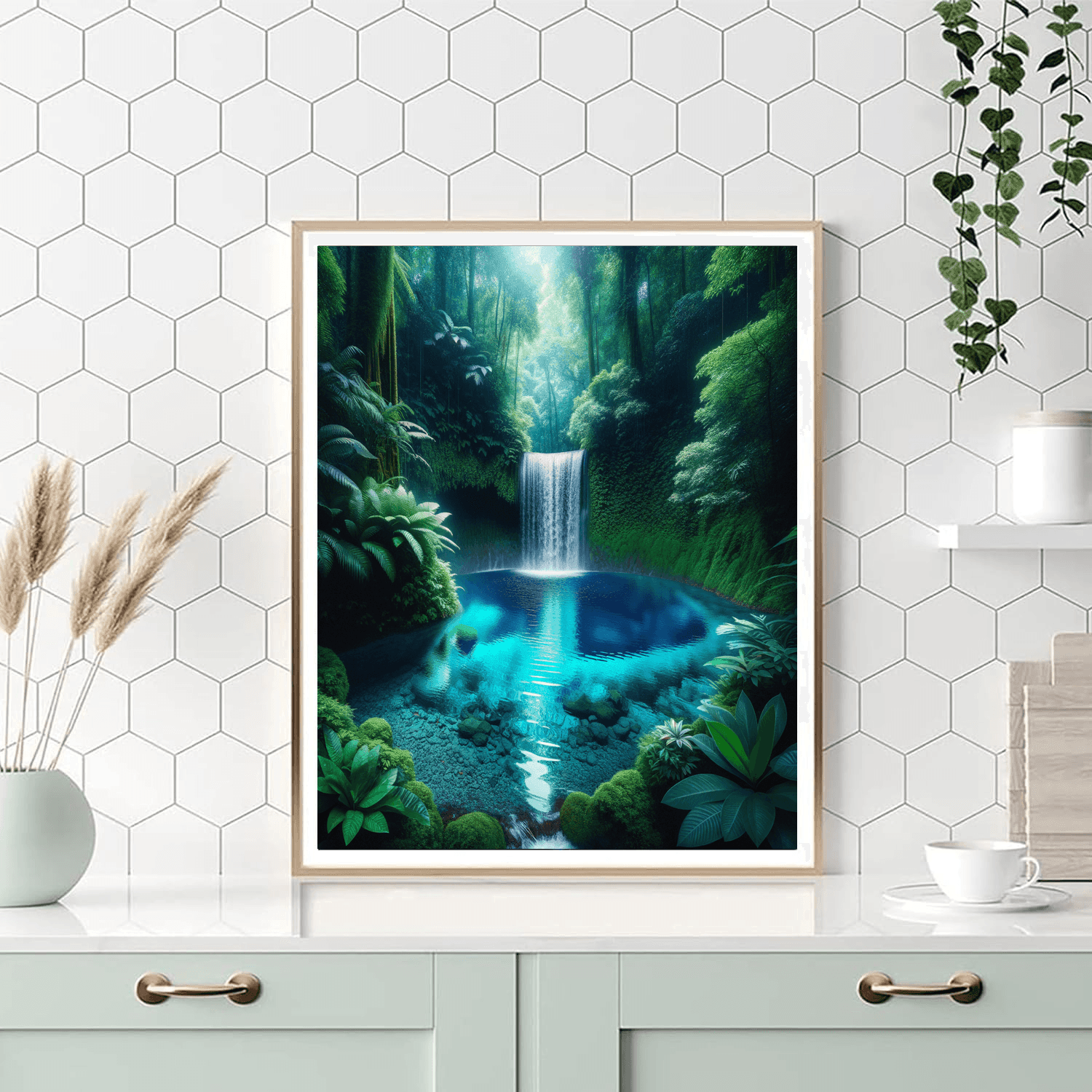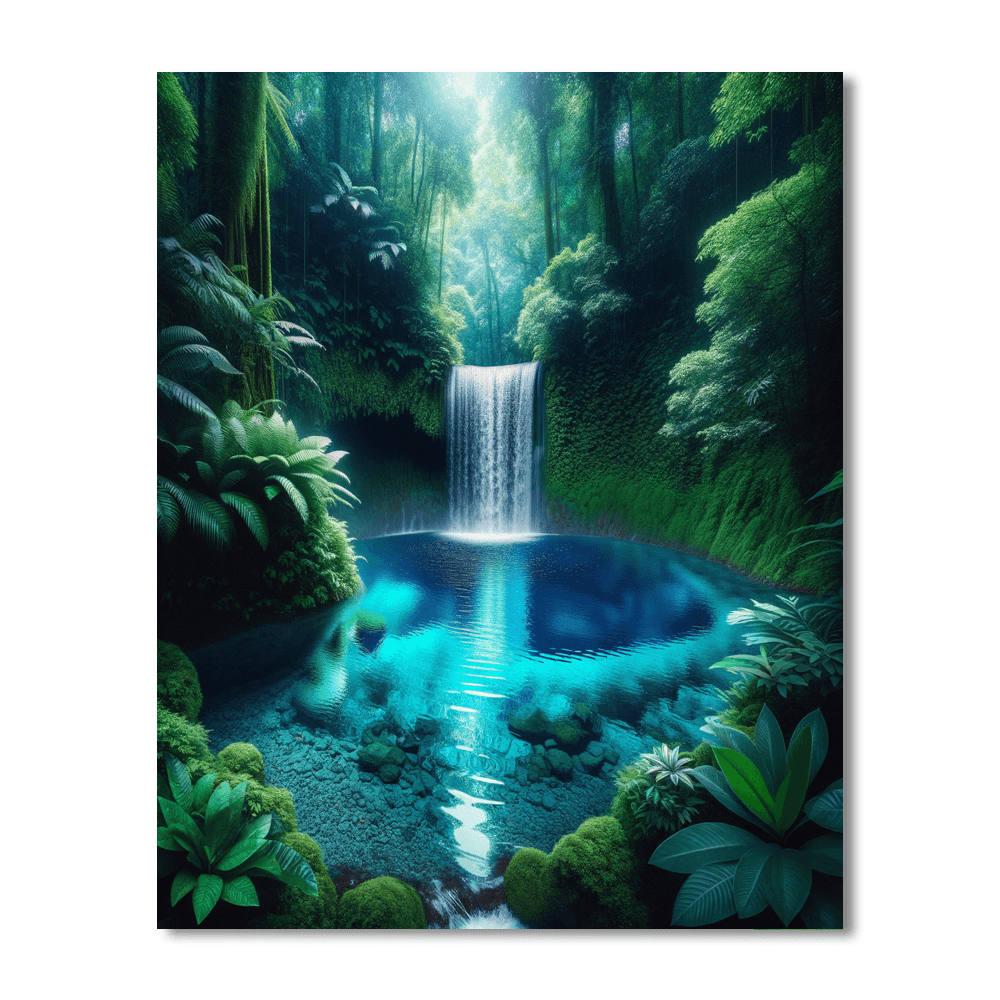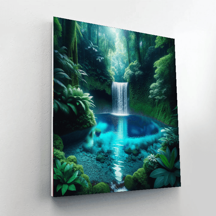 Discover the secluded beauty of Hidden Waterfall Oasis. This piece depicts a hidden waterfall cascading into a crystal-clear pool, surrounded by lush, tropical foliage. The sound of water and the vibrant greenery create a tranquil, hidden paradise, perfect for adding a natural, calming element to any room, especially bathrooms or spa-like environments.