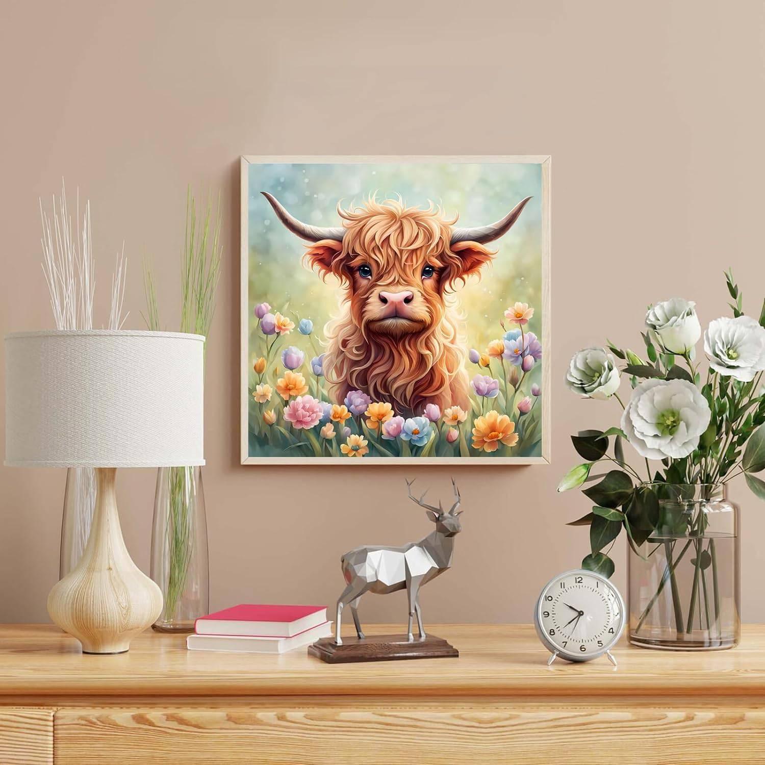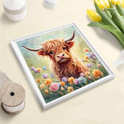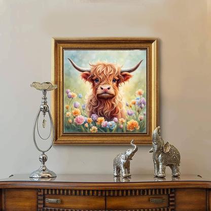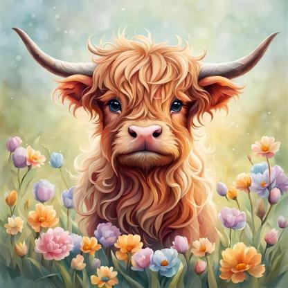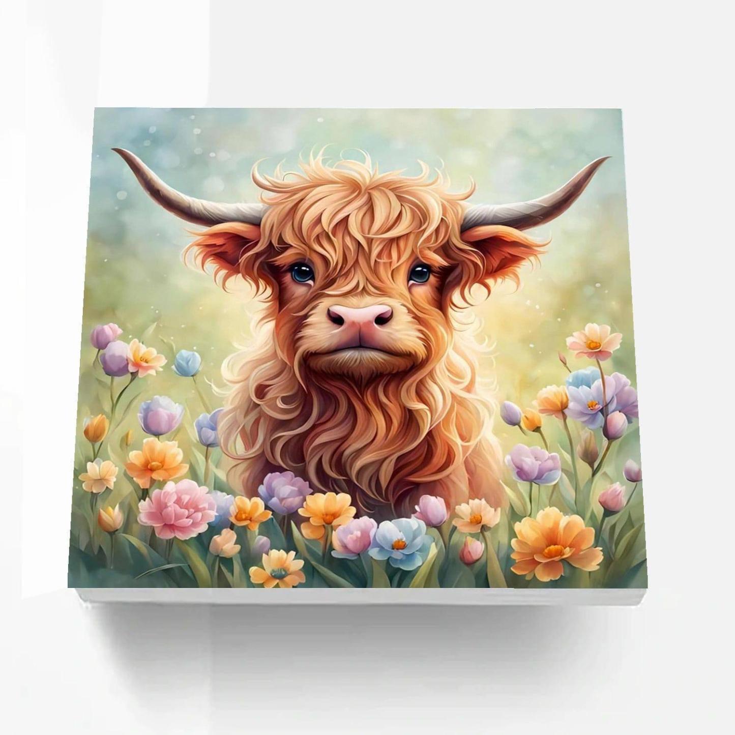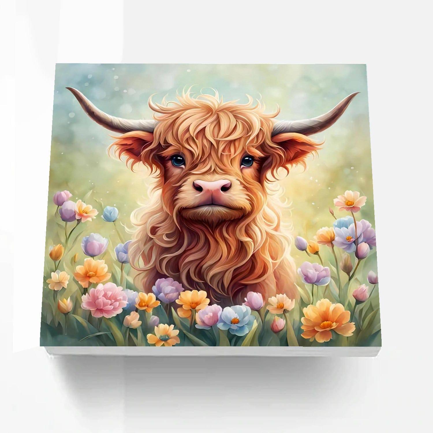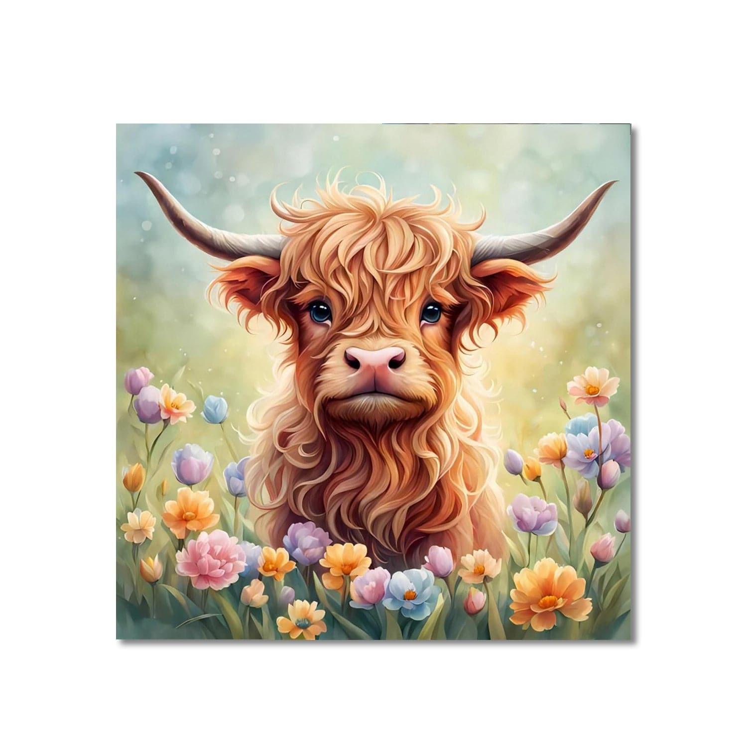 Pattern: A lively mix of pastel-toned flowers provides a soft backdrop to the central figure of the highland cow.