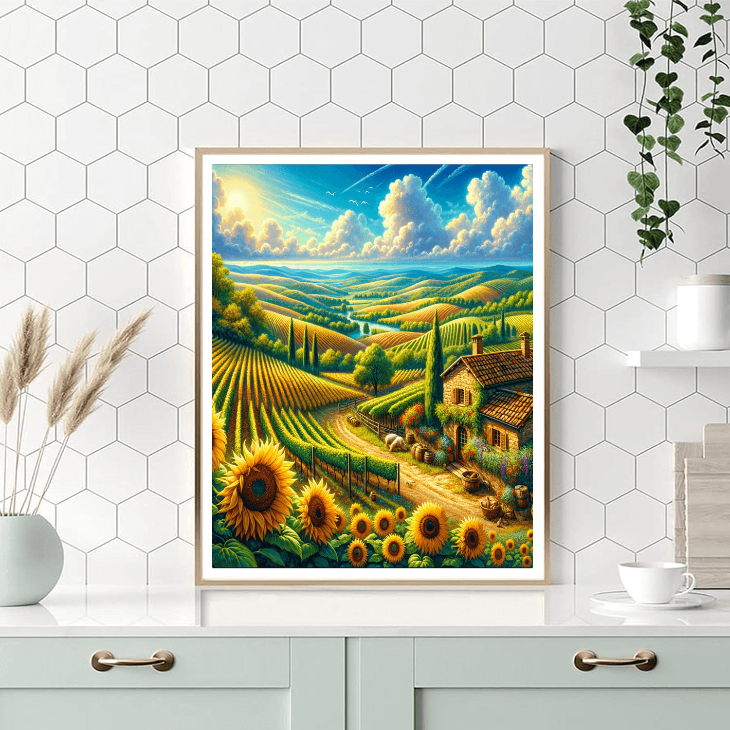 Italian Scenic Delight captures the romantic beauty and charm of Italys countryside. This piece is perfect for a kitchen or dining room, offering a glimpse into the idyllic landscapes and rich culture of Italy. It invites you to savor the flavors and experiences of Italy, bringing a touch of Mediterranean warmth to your home.