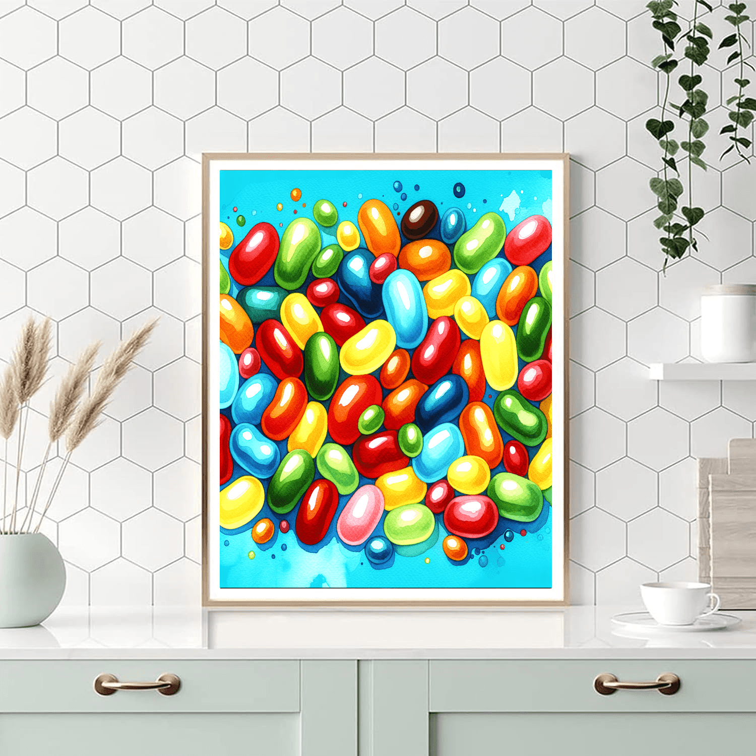 Celebrate creativity with the Joyful Jellybean! This fun product invites kids to paint a whimsical scene of colorful jellybeans scattered across a bright background. Designed for children aged 7-12, it encourages artistic expression while celebrating the joy of sweets. This delightful scene is perfect for a childs bedroom or playroom, adding a touch of fun and color to their decor.