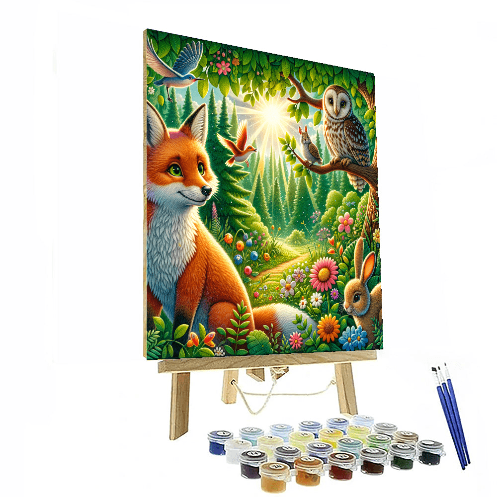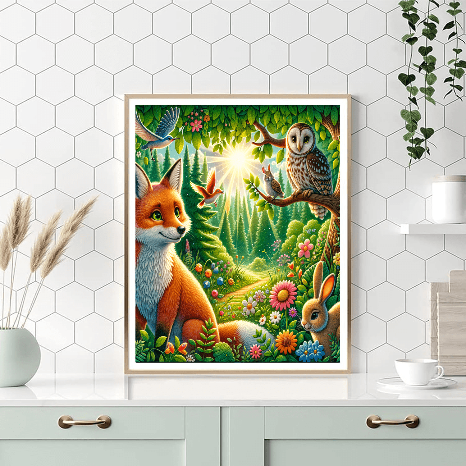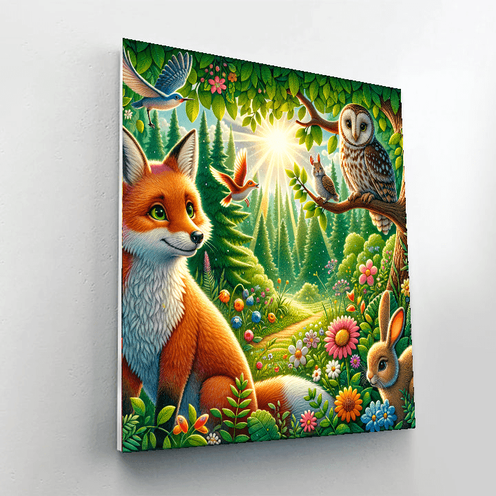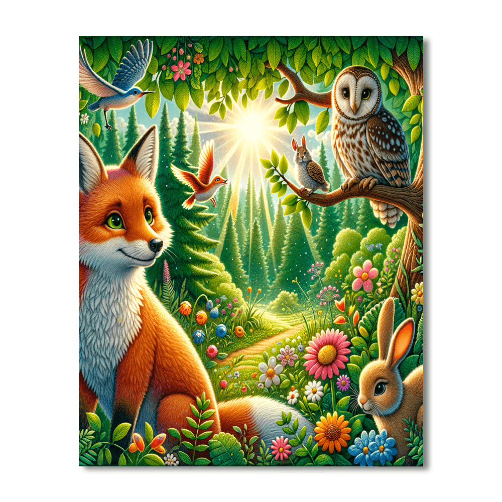Delight in the beauty of nature with this whimsical depiction of a joyful woodland adventure. Featuring playful animals, vibrant flowers, and lush greenery, this artwork captures the joy and wonder of the natural world. Perfect for a childs bedroom or playroom, it sparks creativity and imagination. The lively colors and playful composition create an inviting atmosphere that encourages exploration and fun. This piece serves as a celebration of the beauty of wildlife and the happiness found in nature.