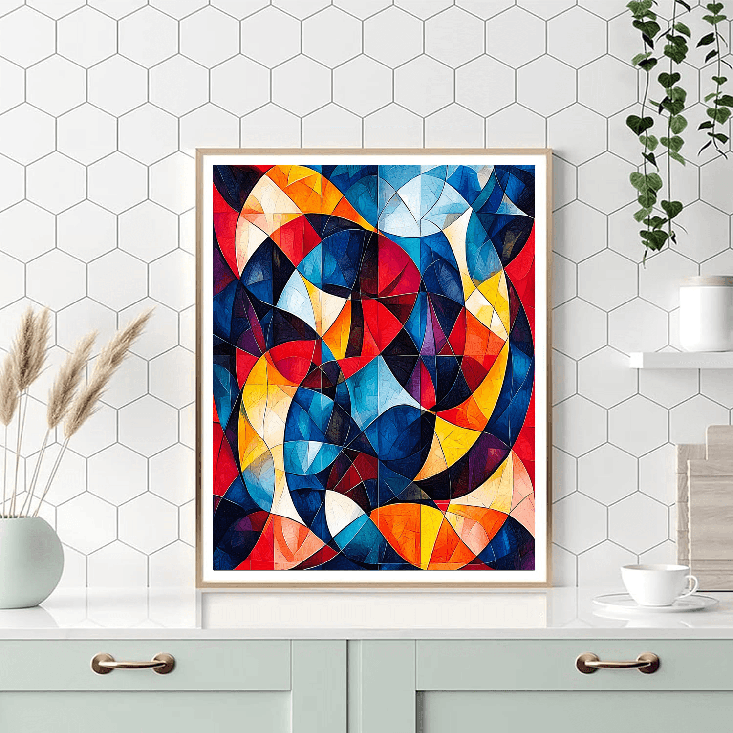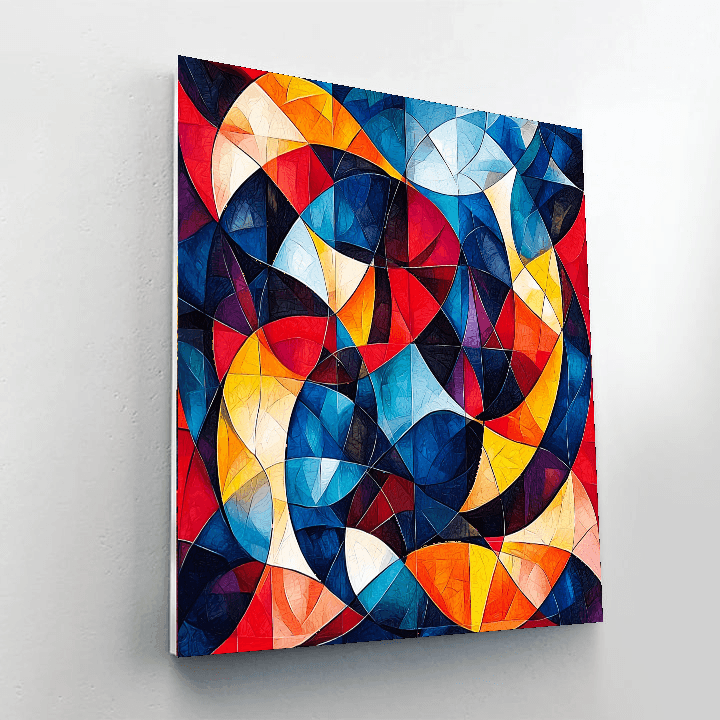 A captivating piece that plays with shapes and colors, this artwork is perfect for a modern living room or creative workspace. The intricate patterns and vibrant hues invite exploration and contemplation, making it an excellent choice for those who appreciate abstract designs. This piece adds a touch of sophistication and intrigue to any space.