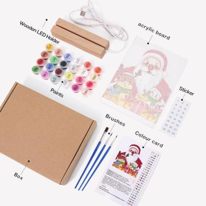 Everything you need is included: a pre-printed board, high-quality acrylic paints, precision brushes, and a wooden LED base.