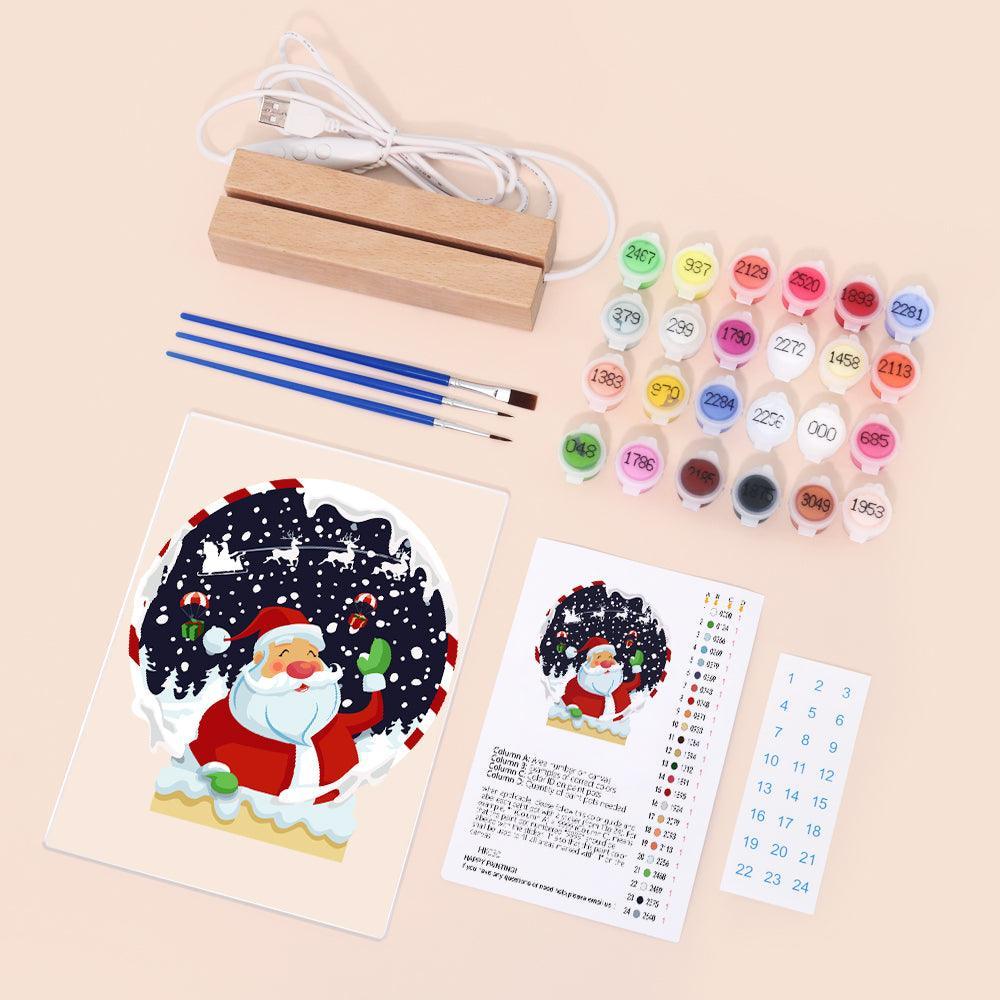 Create a magical winter scene with the LED Santa Snow Globe Paint by Numbers Kit. This kit includes a pre-printed art board with clear outlines, vibrant acrylic paints, and detail brushes, making it easy to bring this festive design to life. The LED base adds a soft glow, highlighting your finished artwork, making it a beautiful addition to your holiday décor or a thoughtful gift for those who enjoy crafting.
