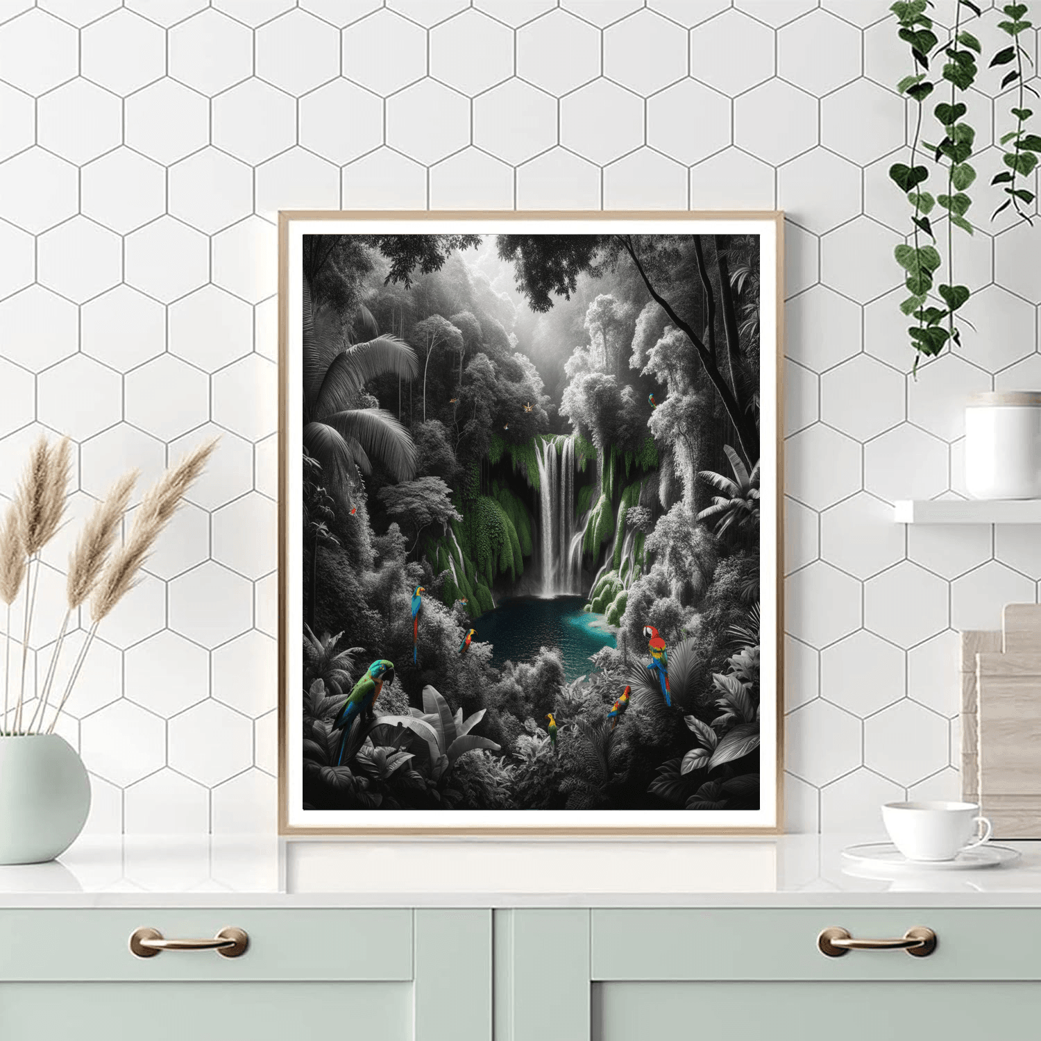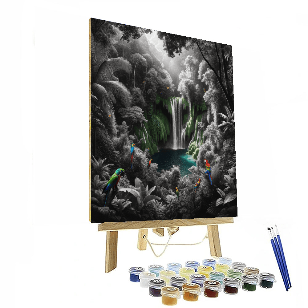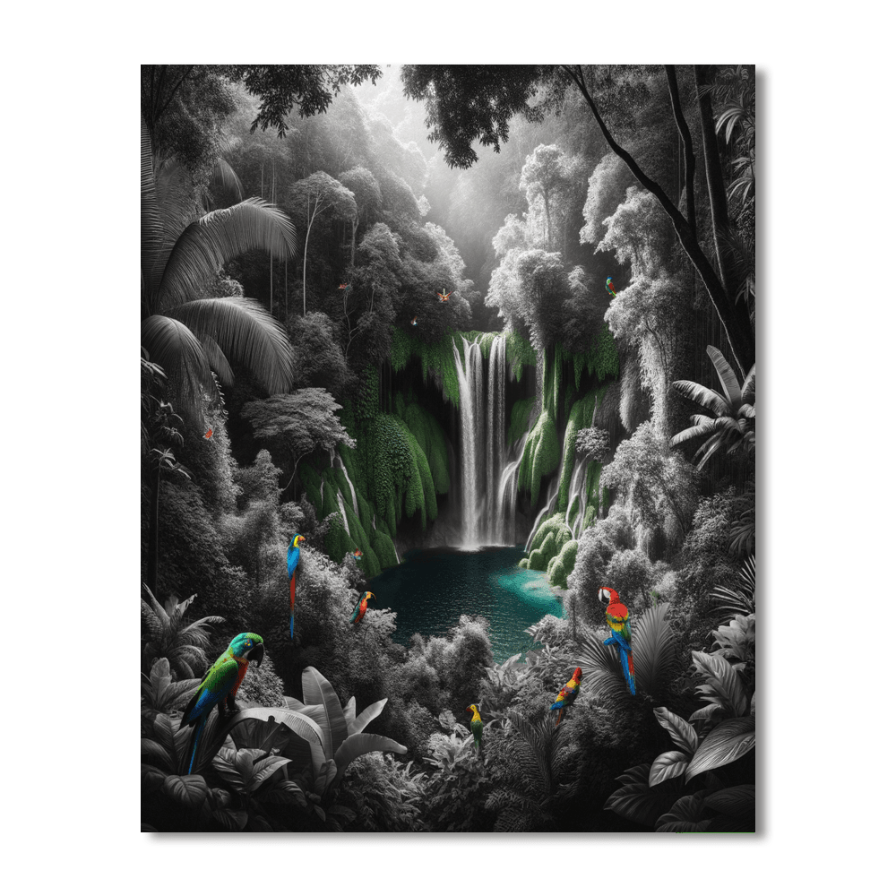 Escape to a tropical paradise with this lush depiction of a rainforest waterfall oasis. The scene is vibrant with rich greens of various shades and the refreshing blue of a waterfall cascading into a serene pool. This artwork invites a sense of adventure and relaxation, making it an excellent addition to spaces needing a splash of color and natural beauty, such as bathrooms or sunrooms. Its a perfect pick for nature lovers and those who seek a zen-like painting experience.