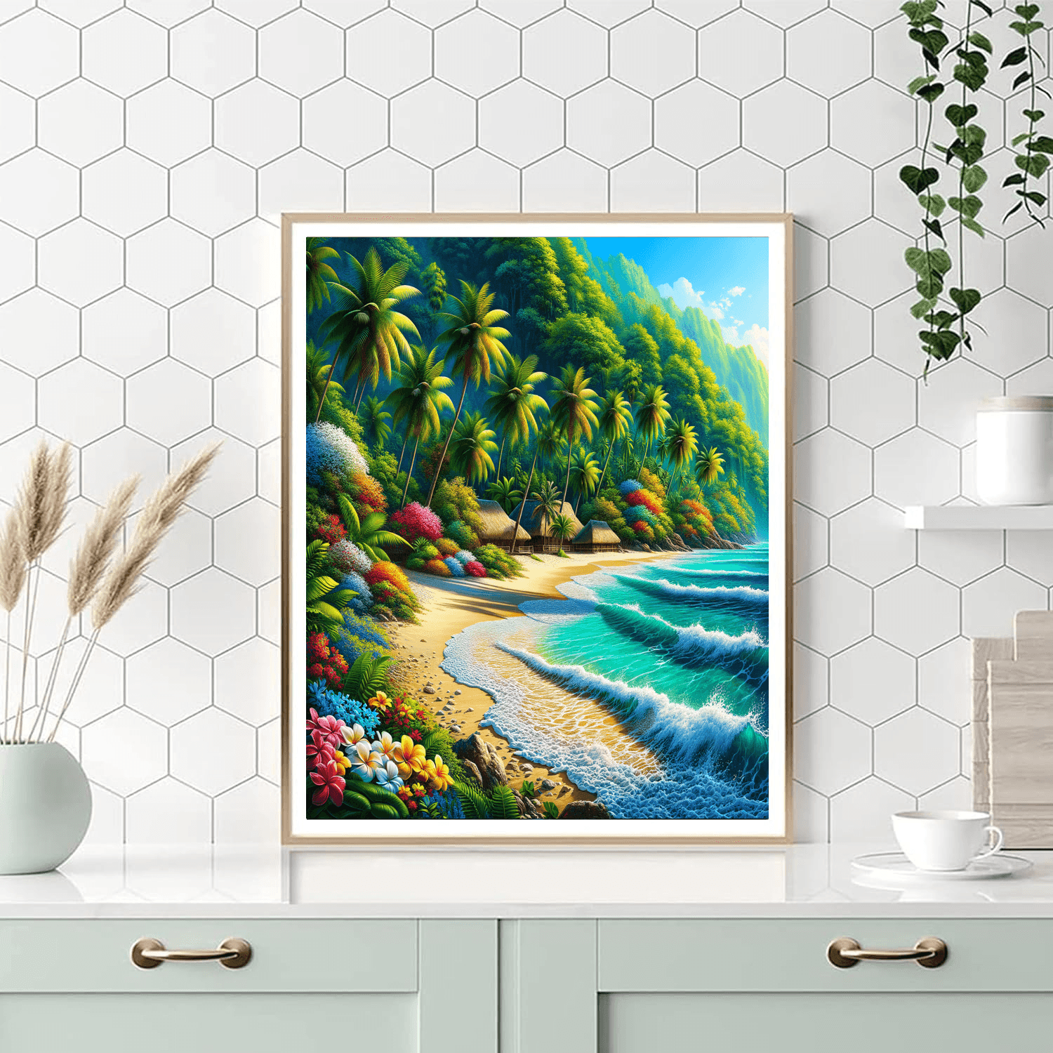 Escape to a tropical paradise with Lush Tropical Oasis. This artwork features a stunning scene of a secluded beach surrounded by palm trees and vibrant flowers. The bright colors and serene atmosphere create a sense of relaxation and escape, making it a perfect addition to any home. Ideal for a living room or sunroom, this piece brings the essence of a tropical getaway indoors.