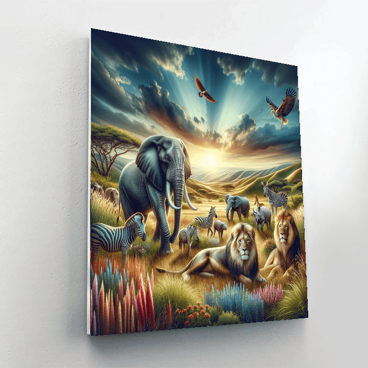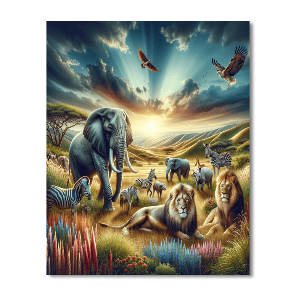 This majestic depiction of wildlife captures the beauty of nature in its purest form. Featuring animals like lions, elephants, and zebras in their natural habitat, this piece is perfect for adding a touch of adventure to a living room or study. The stunning imagery and rich colors inspire a sense of wonder and appreciation for the natural world.