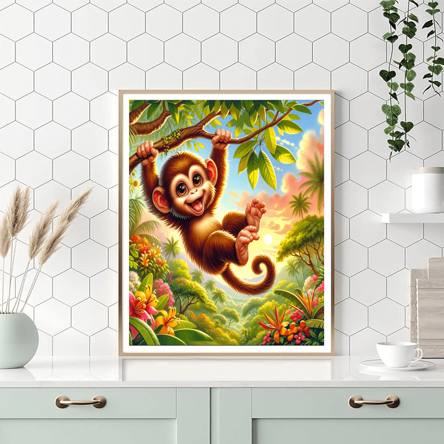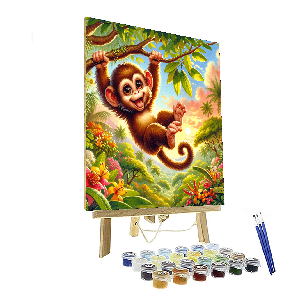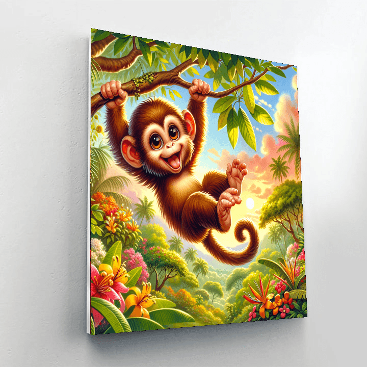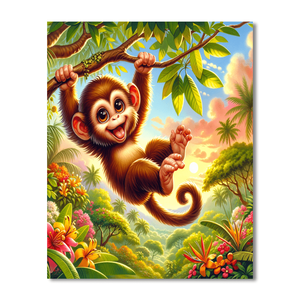 This playful product features a merry monkey swinging through the trees. Kids will love adding their own colors to this fun scene while learning about monkeys and their habitats. This design encourages creativity and curiosity about wildlife. The completed artwork can be displayed in a childs bedroom or play area, inspiring a love for animals and nature.