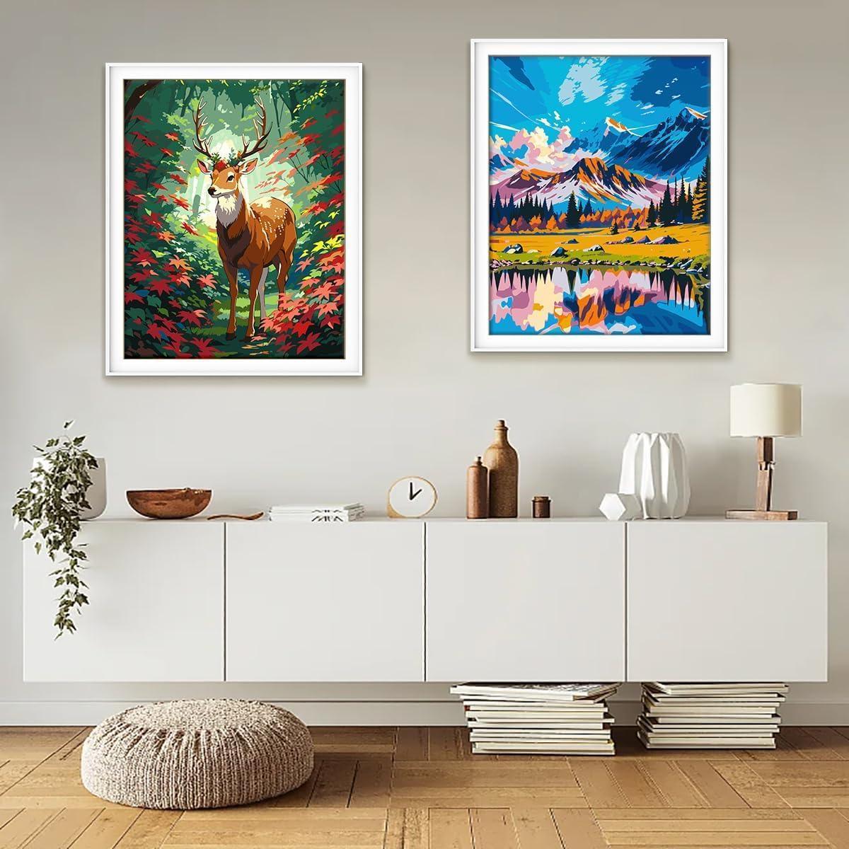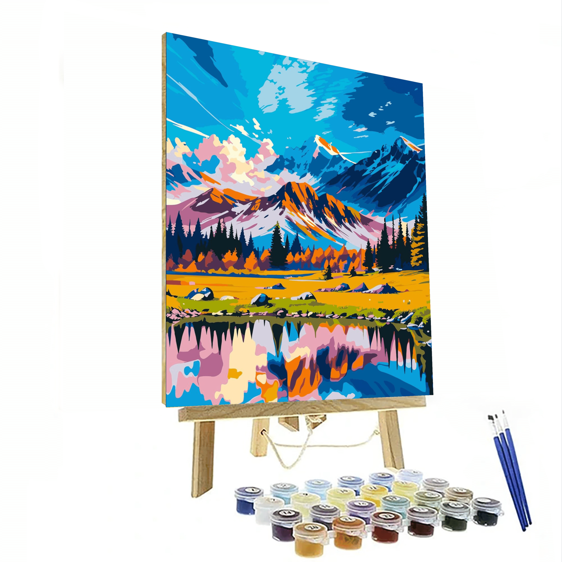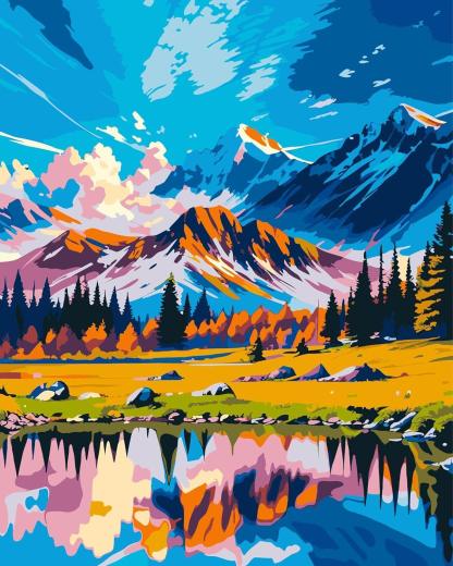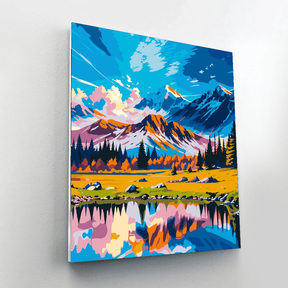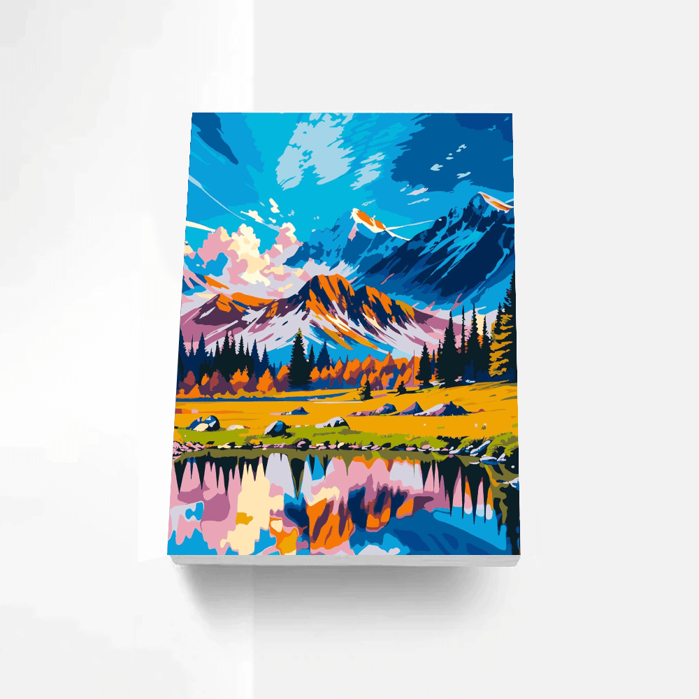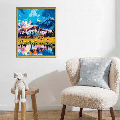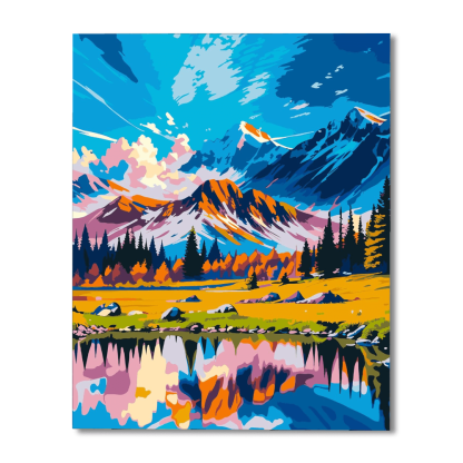Immerse yourself in the "Mountain And Lake Scenery Painting Kit," where the grandeur of towering mountains meets the stillness of an alpine lake. This artwork captures the vibrant interplay of light and color, reflecting the natural beauty of a tranquil mountainscape.