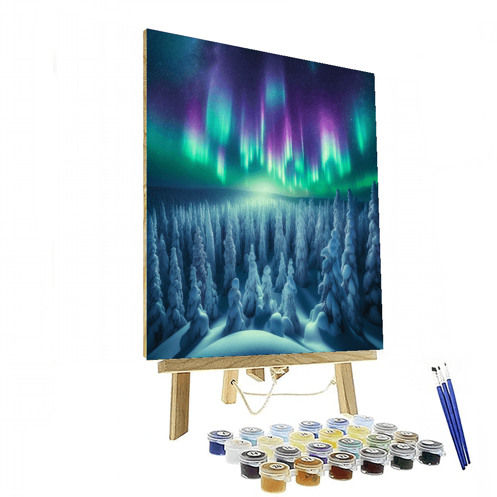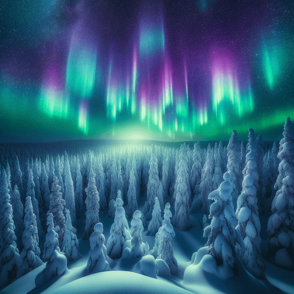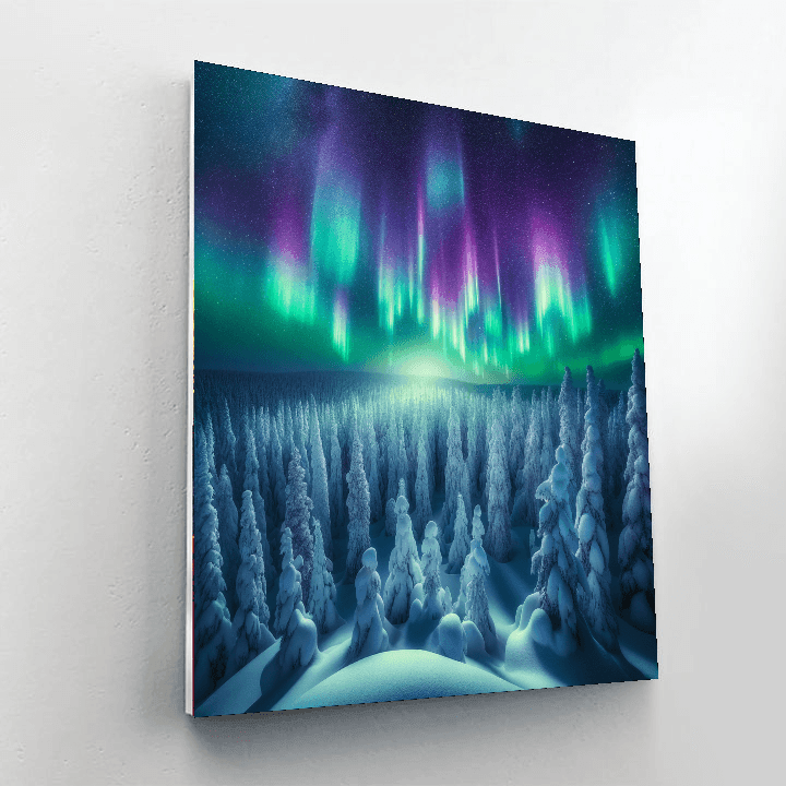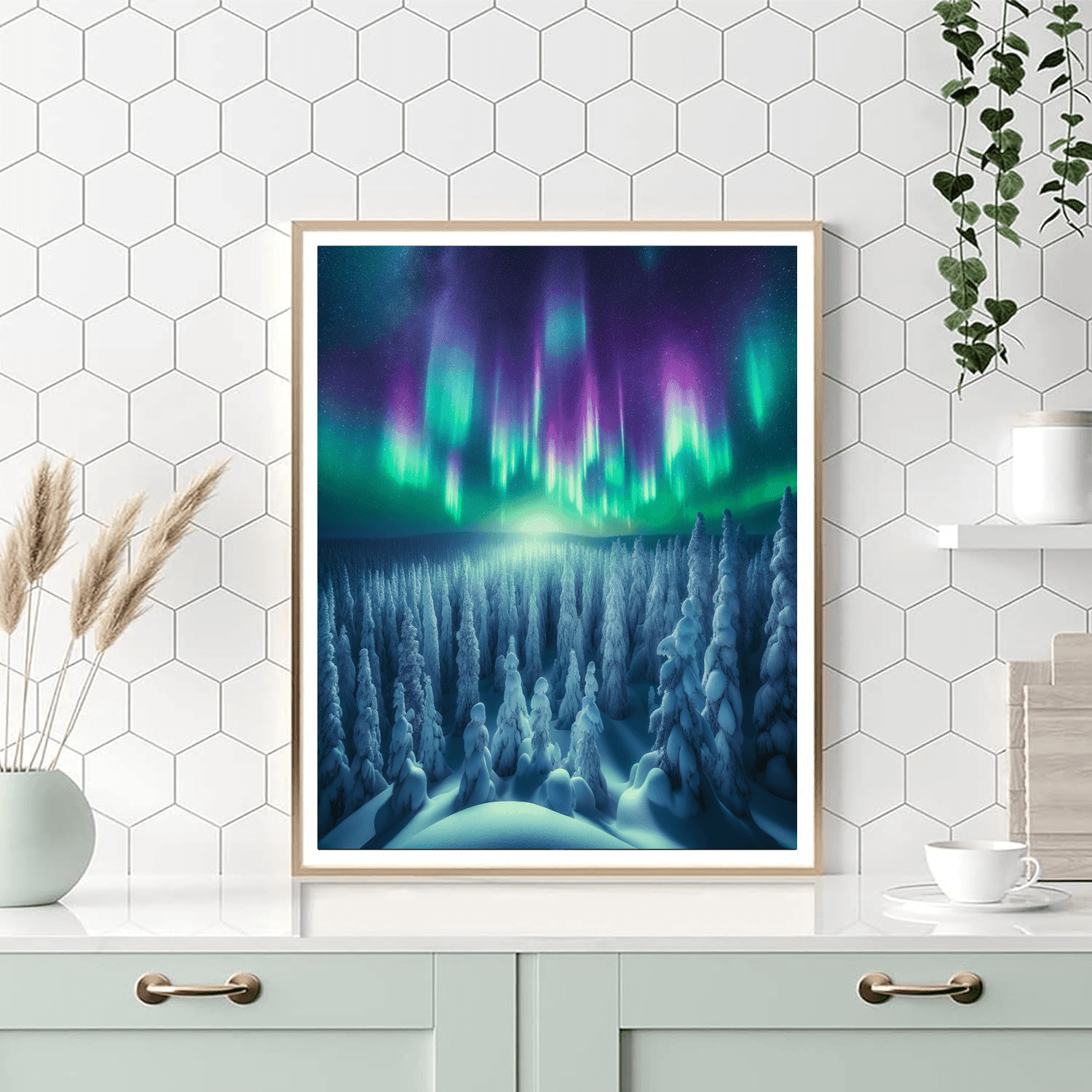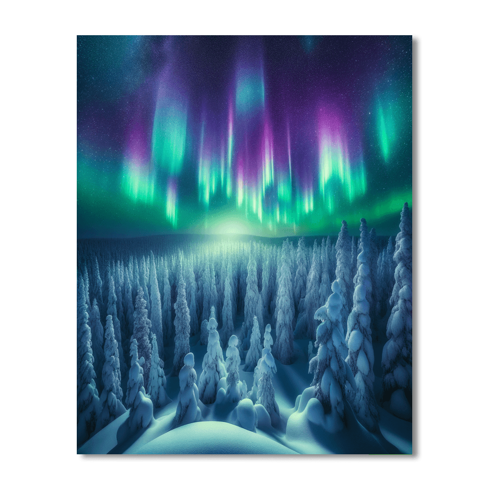 Mystic Aurora Forest is a mesmerizing depiction of a dense forest under the spellbinding aurora borealis. The vibrant colors of the aurora light up the sky in shades of green and purple, casting an ethereal glow on the snow-covered trees below. This piece is ideal for anyone looking to bring a touch of natures magic into their home. It would look particularly striking in a living room or a bedroom, creating a peaceful and awe-inspiring focal point that invites viewers to dream and escape.