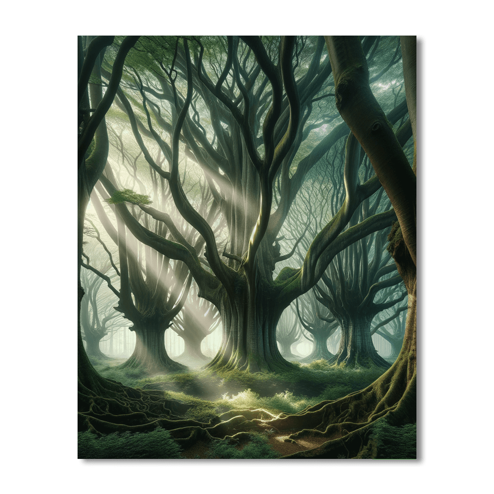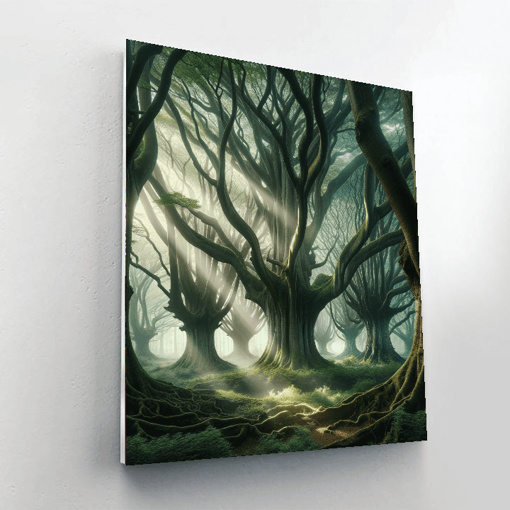 Mystic Forest transports viewers into a magical woodland filled with ancient trees whose branches twist and turn towards the sky, shrouded in a gentle mist. This enchanting forest is bathed in a soft, ethereal light that filters through the leaves, creating a mystical atmosphere. Perfect for spaces used for meditation or reflection, such as a home studio or a quiet corner in a living room, this piece invites contemplation and offers a daily dose of magic and tranquility.
