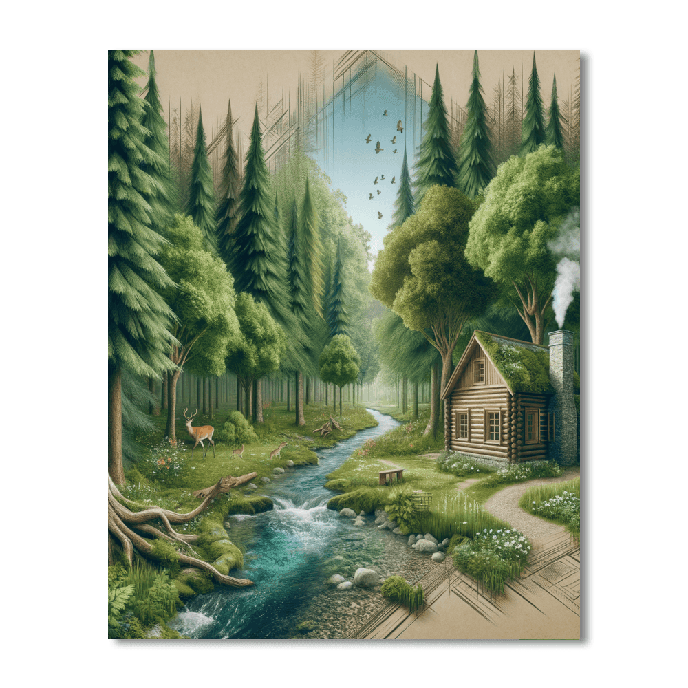 Step into a world of tranquility with this beautiful scene depicting a serene forest retreat. Perfect for your living room or bedroom, this piece will bring a sense of calm and peace to any space. The detailed depiction of towering trees, a gentle stream, and a cozy cabin nestled among the foliage creates a captivating escape from the hustle and bustle of everyday life.