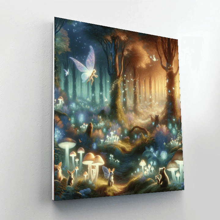 A magical forest scene with enchanted trees, glowing mushrooms, and mystical creatures. Ideal for a childs bedroom or playroom.