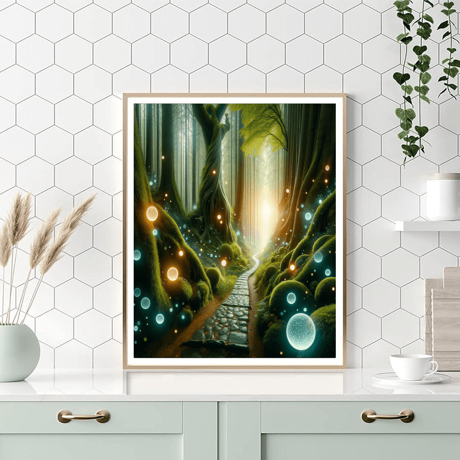 Step into a mystical realm with Mystical Forest Pathway. This scene leads the viewer down a captivating path under the canopy of an ancient, enchanted forest. Twinkling lights and subtle hints of magical creatures peeking from behind the trees add to the allure. Ideal for sparking imagination, this piece would be a charming addition to a childs bedroom or a creative studio space. It invites onlookers to wander into a world of fantasy and wonder, making it a delightful escape from the everyday.