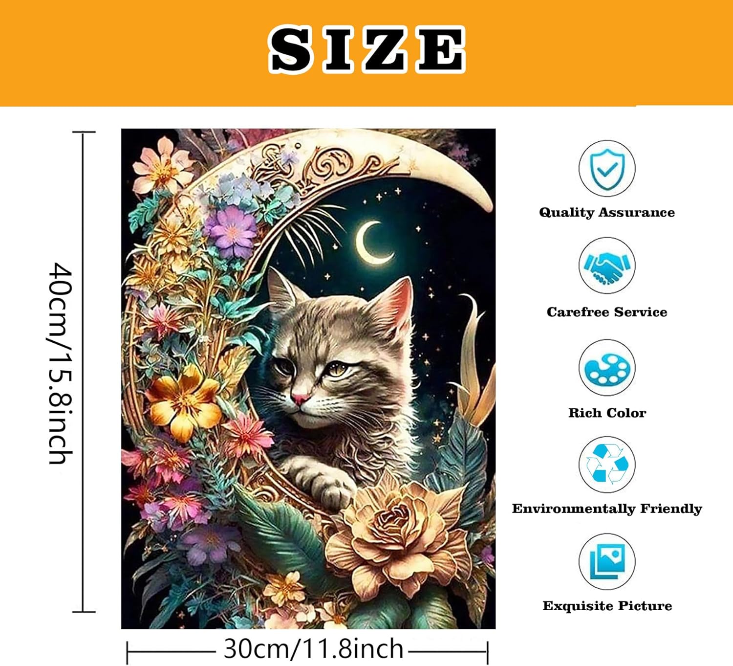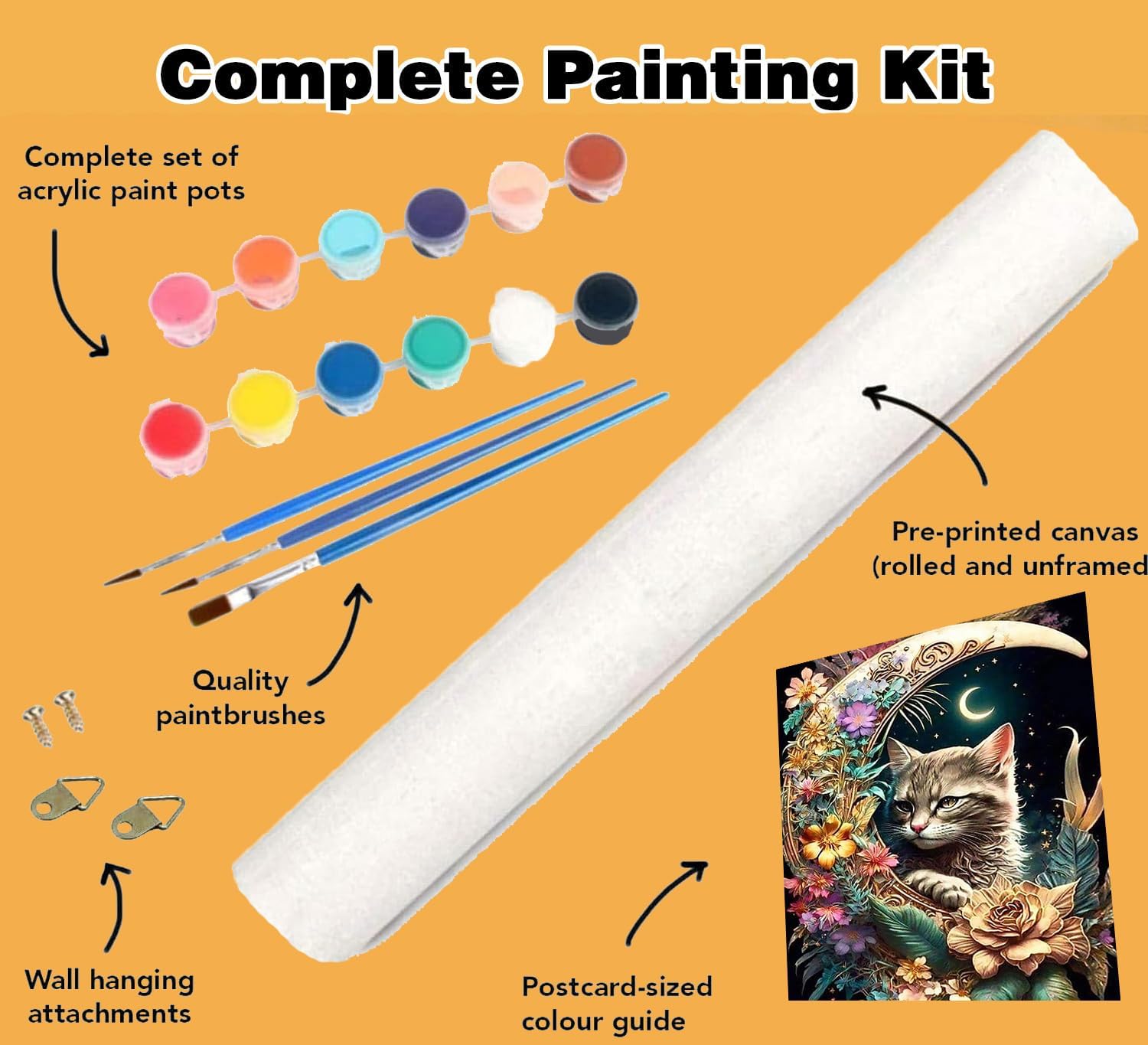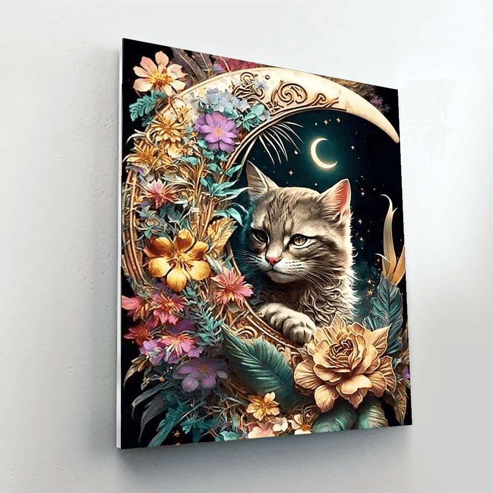 Embrace the tranquility of nocturnal beauty with the Mystical Moonlit Feline Paint By Numbers Kit. This art project beckons you into a world where florals intertwine with the grace of a feline under the celestial dance of a crescent moon. This painting set presents an illustrative challenge that is both enchanting and gratifying, depicting a serene feline against a backdrop of a lush, starry night.