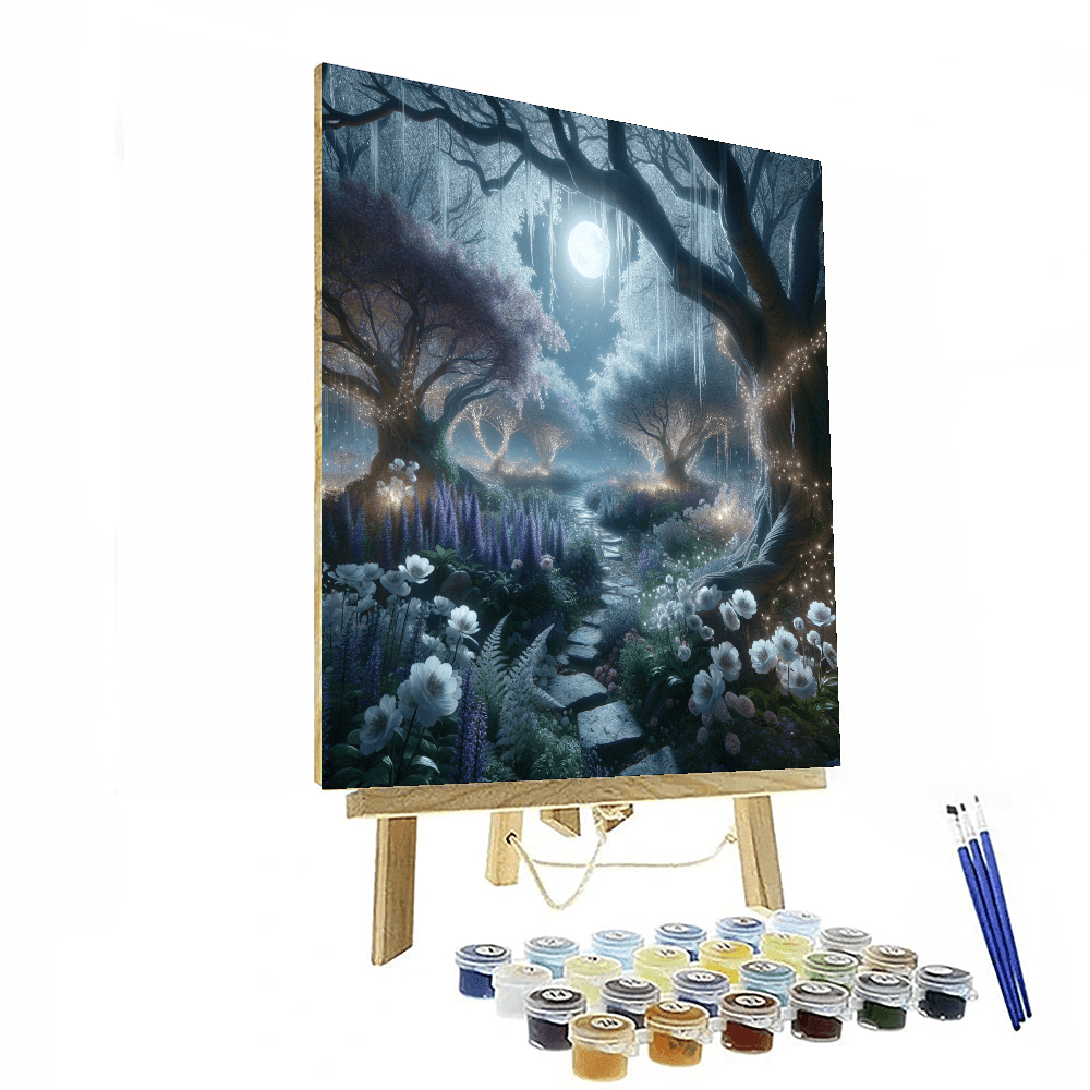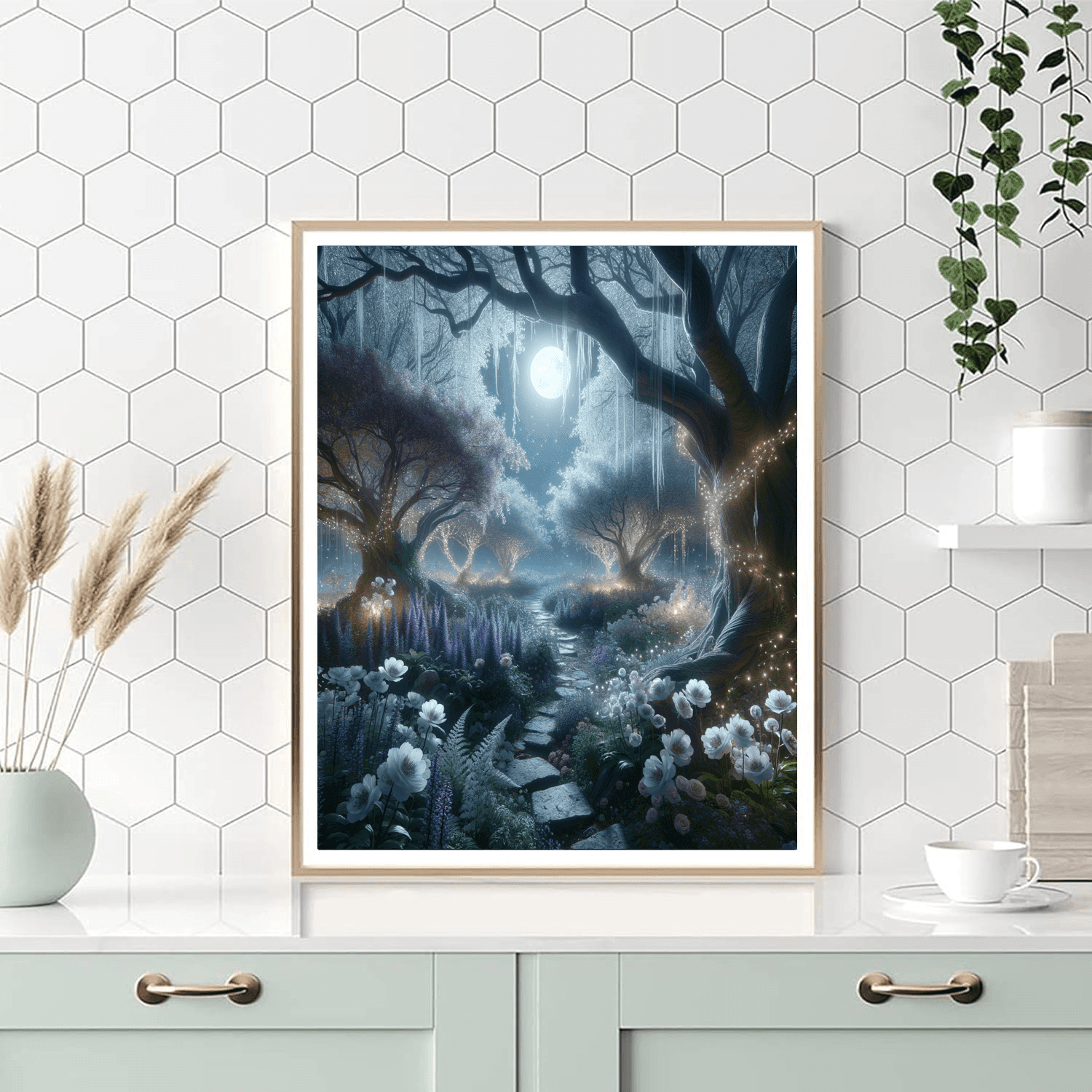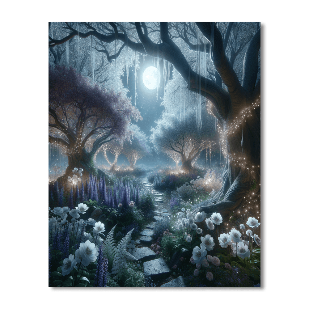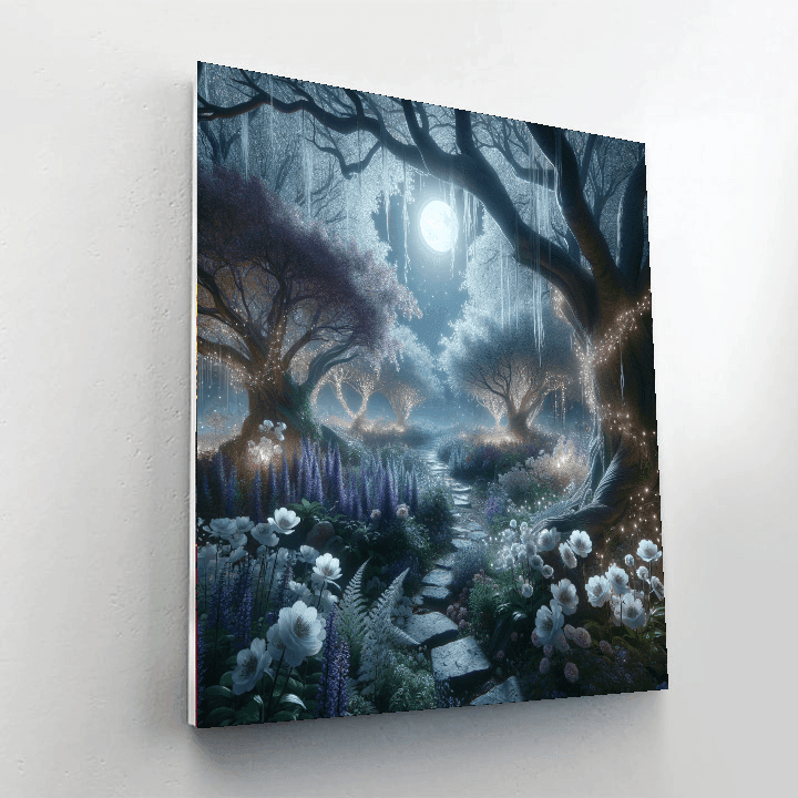 Step into a mystical moonlit scene, where delicate flowers and twinkling lights create an enchanting atmosphere. This serene scene is perfect for a bedroom or study, offering a moment of calm and reflection amidst the hustle and bustle of daily life. The soft colors and gentle composition create a sense of peace and tranquility, making it a perfect choice for those who seek serenity in their home decor.
