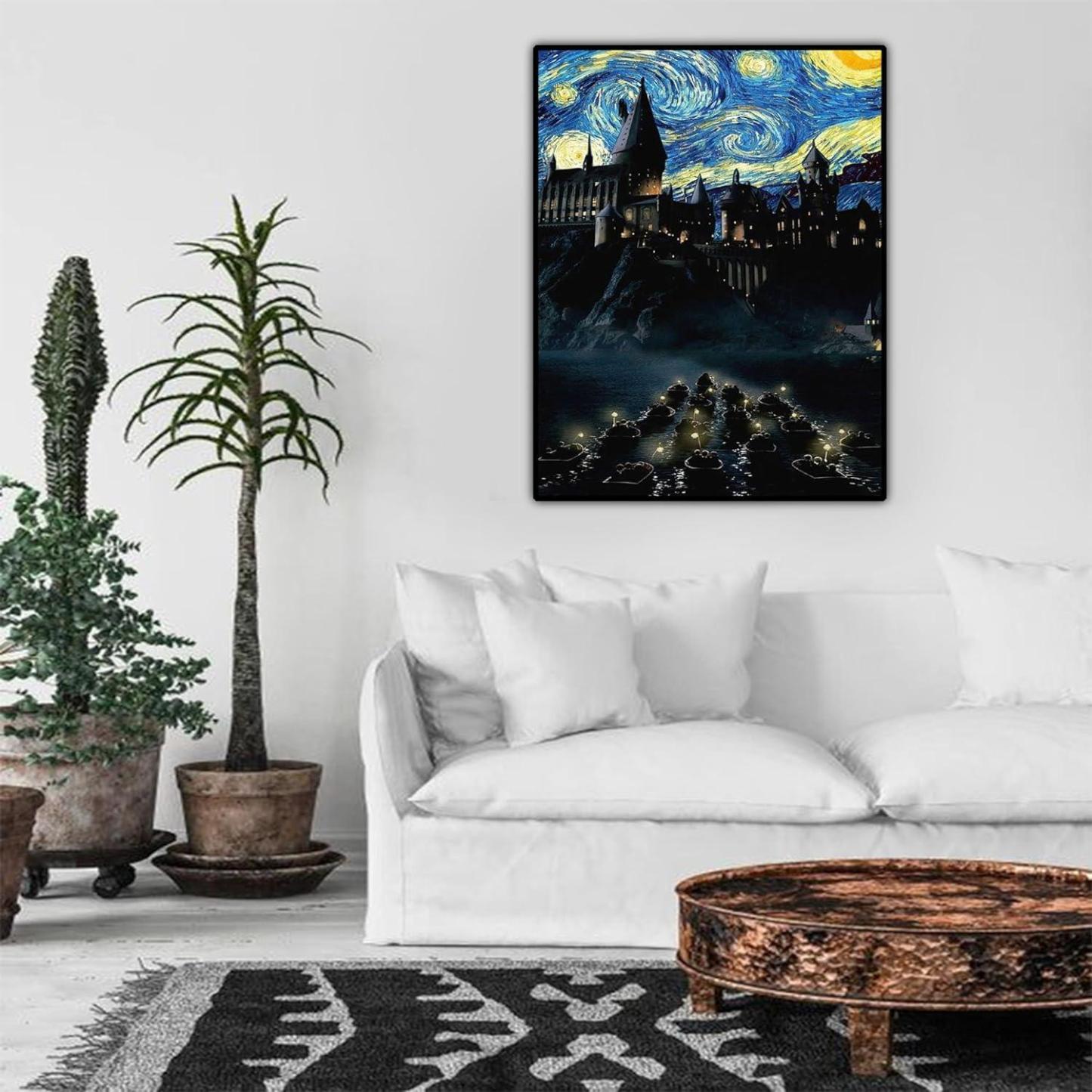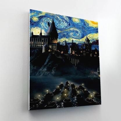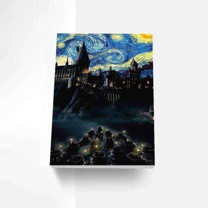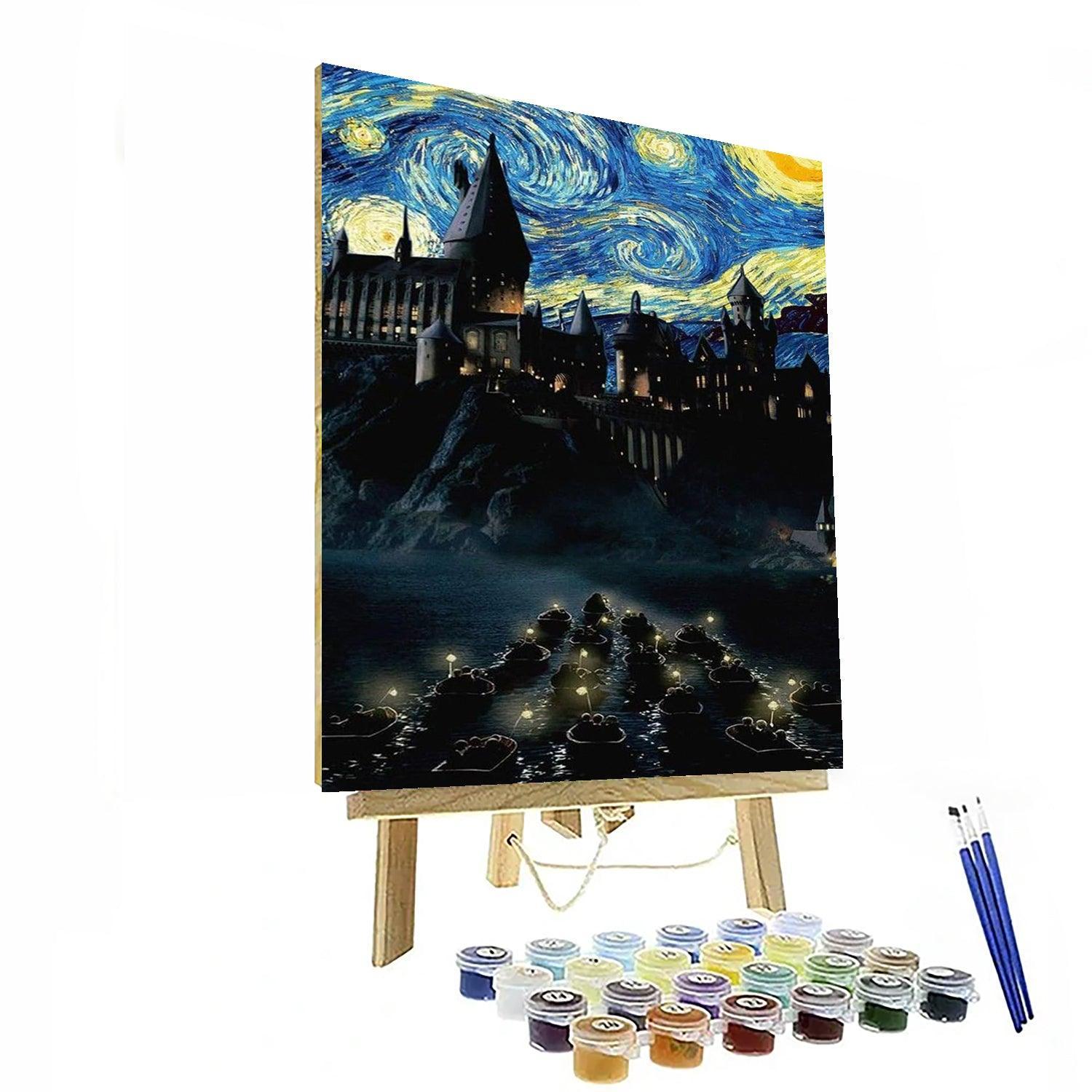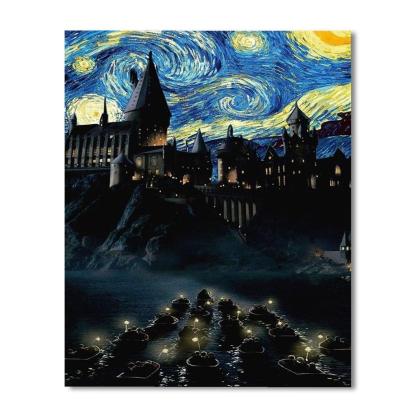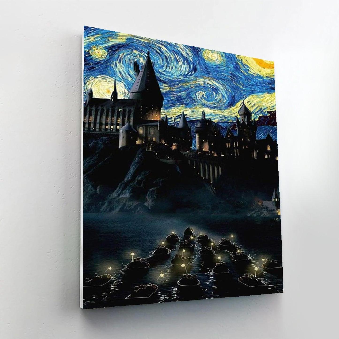 Immerse yourself in the magical ambiance of the Night Sky Castle Paint By Number Kit. This captivating canvas transports you to an otherworldly scene where an enigmatic castle is silhouetted against a swirling, starry night sky, reminiscent of a classic masterpiece with a fantastical twist.