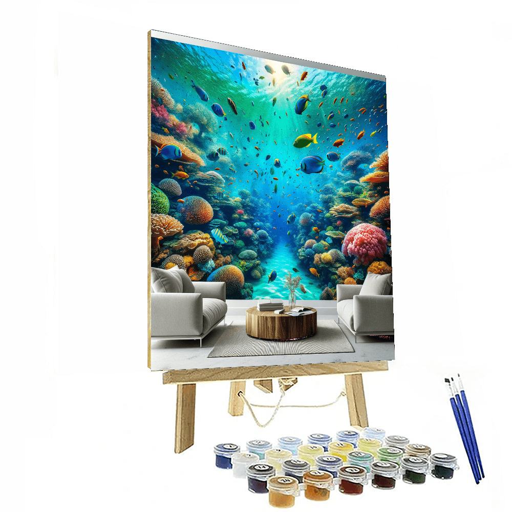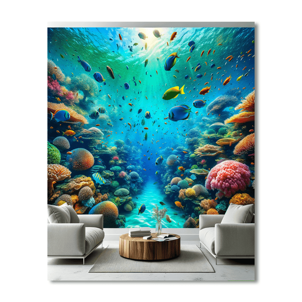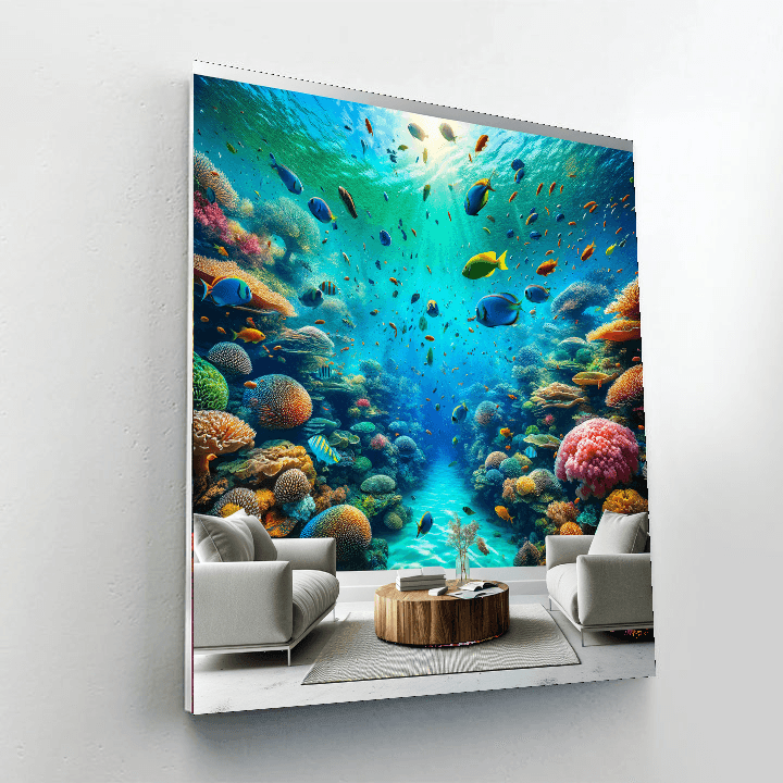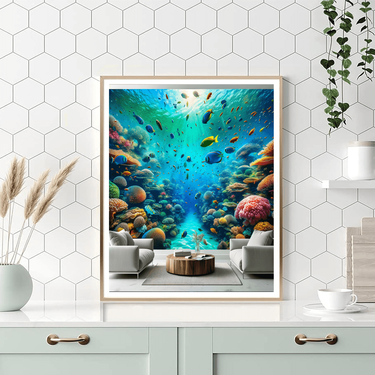 Embark on a journey to an Oceanic Paradise Escape with this stunning painting. Dive into the crystal-clear waters of a tropical paradise, where colorful fish swim among vibrant coral reefs and swaying sea plants. The vivid blues and greens will transport you to a tranquil underwater world, perfect for adding a touch of serenity to your home decor, ideal for a living room or study.