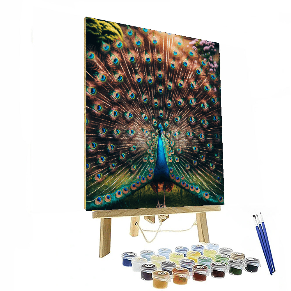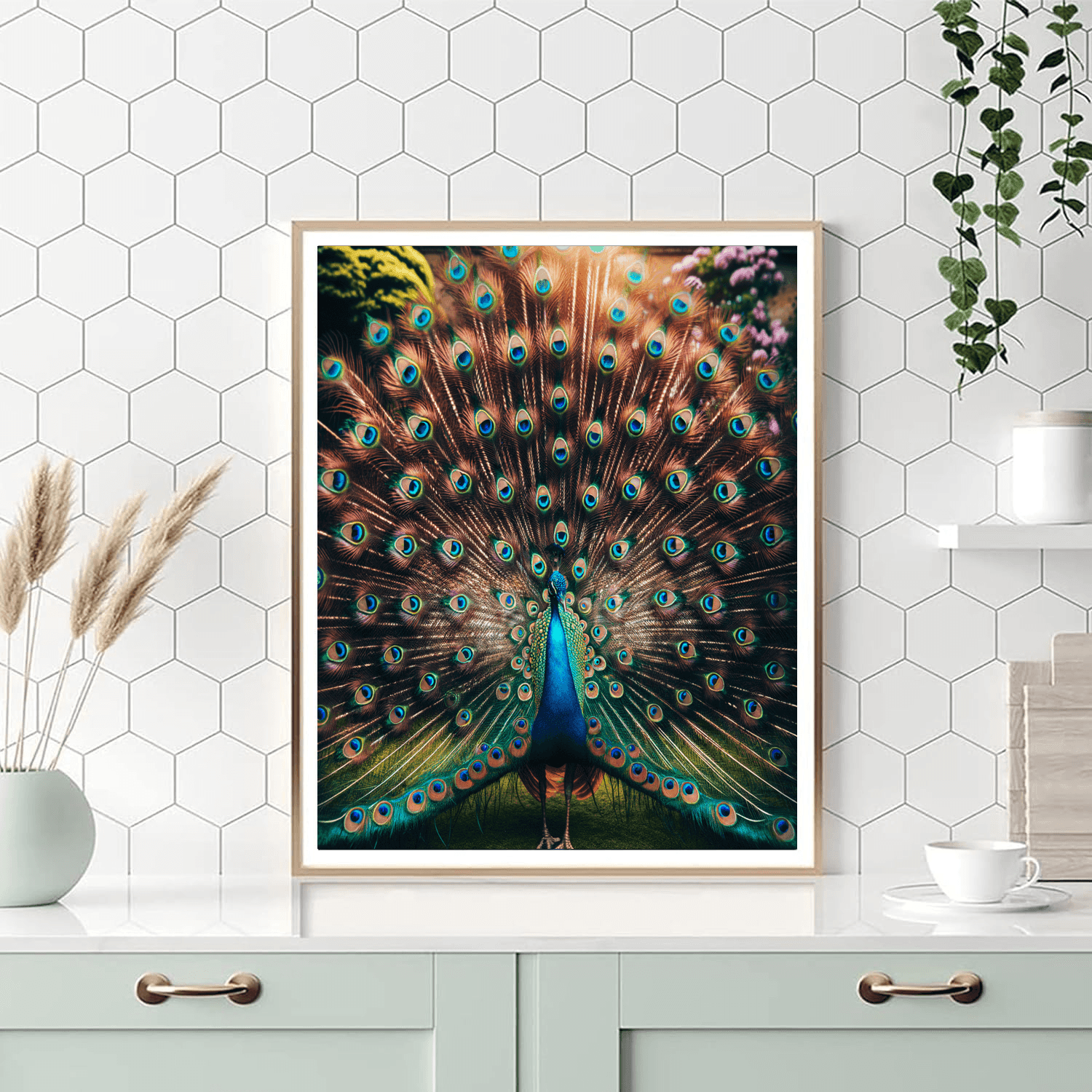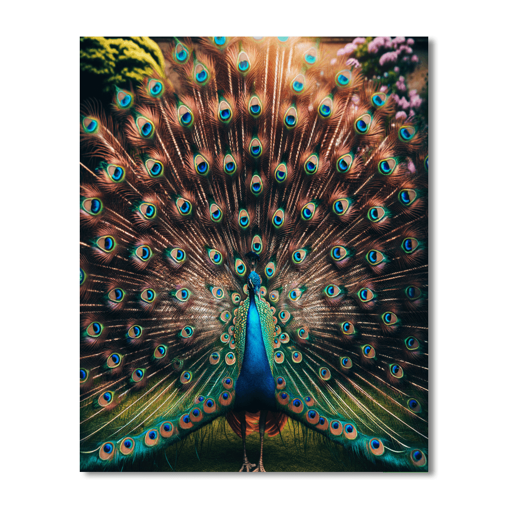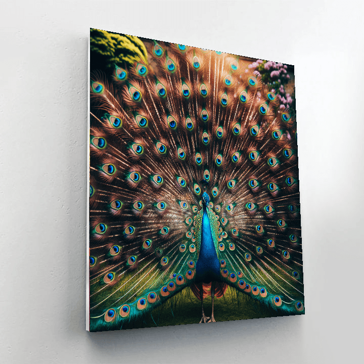 Opulent Peacock Display showcases the magnificent plumage of a peacock in full display, with vibrant blues and greens that captivate the eye. This piece is perfect for those who appreciate wildlife and the stunning beauty of birds. The intricate details of the feathers and the dynamic pose of the peacock make this artwork a focal point, ideal for enhancing the decor of spaces like living rooms or hallways where art can be appreciated up close.