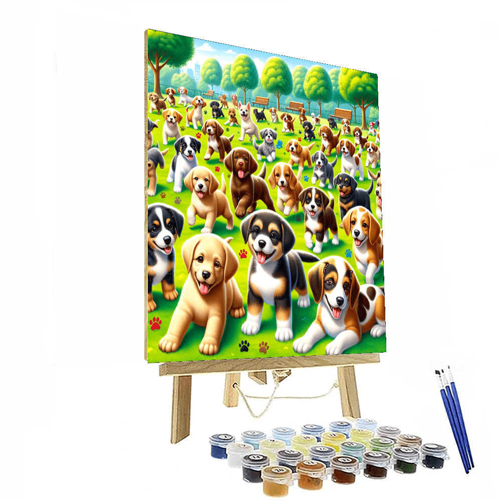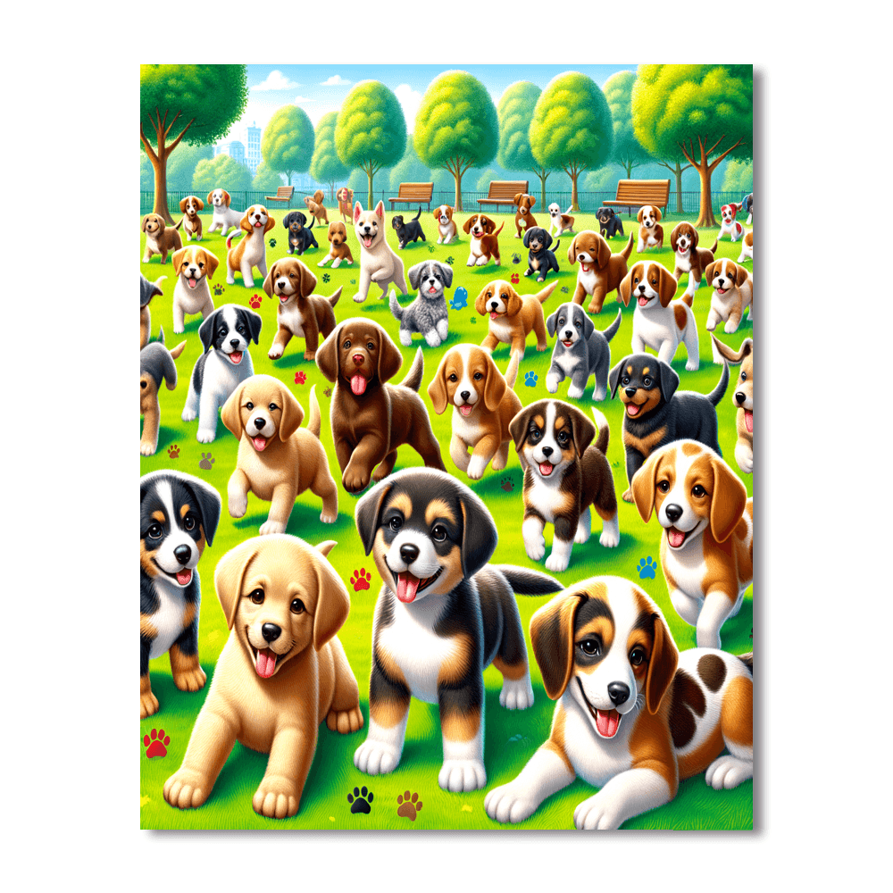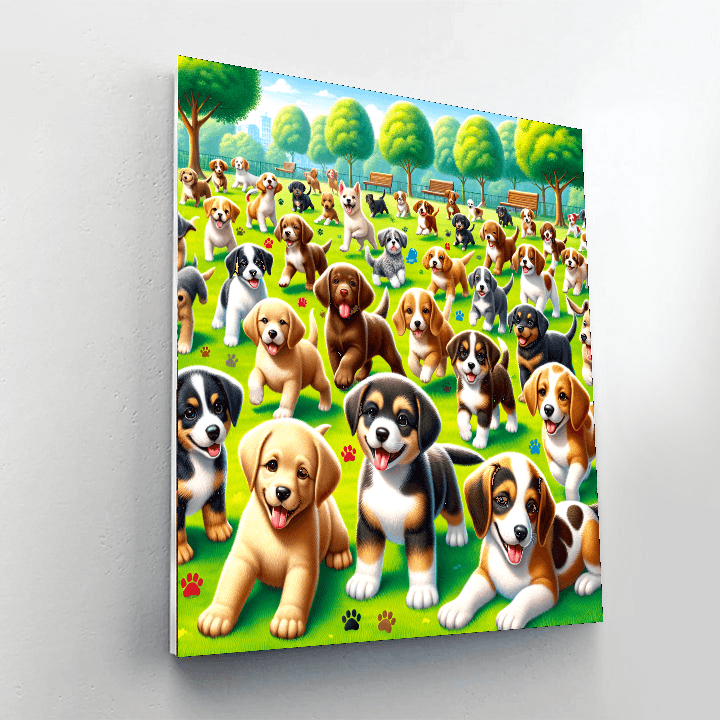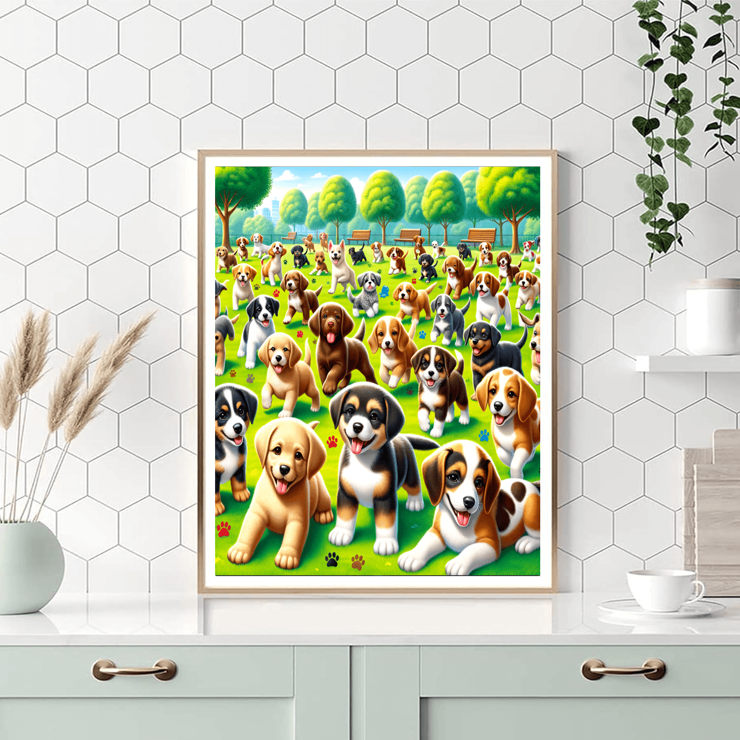 Delight in a playful parade of puppies in a park. Perfect for a childs bedroom or playroom, this piece adds a touch of joy and cuteness to any space.
