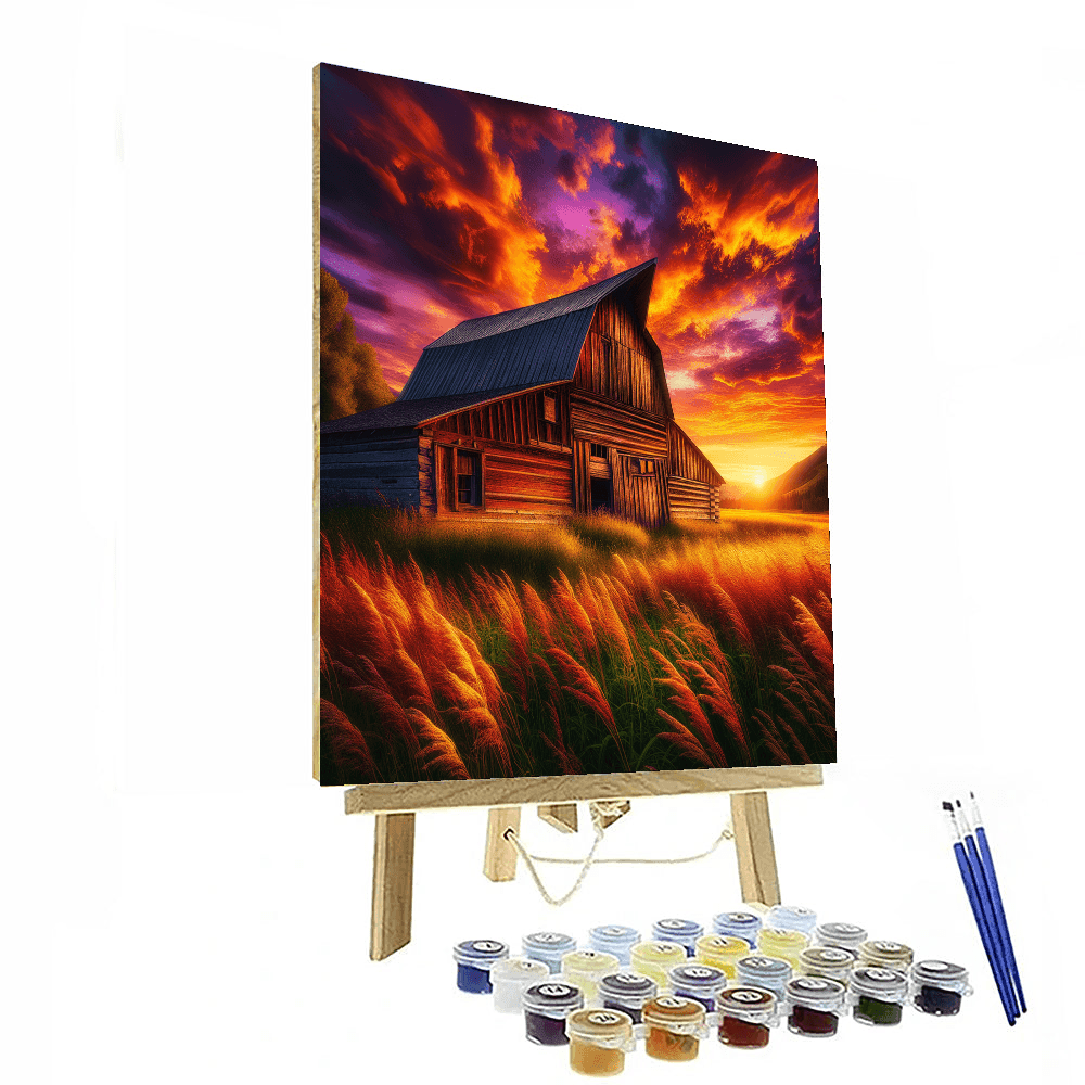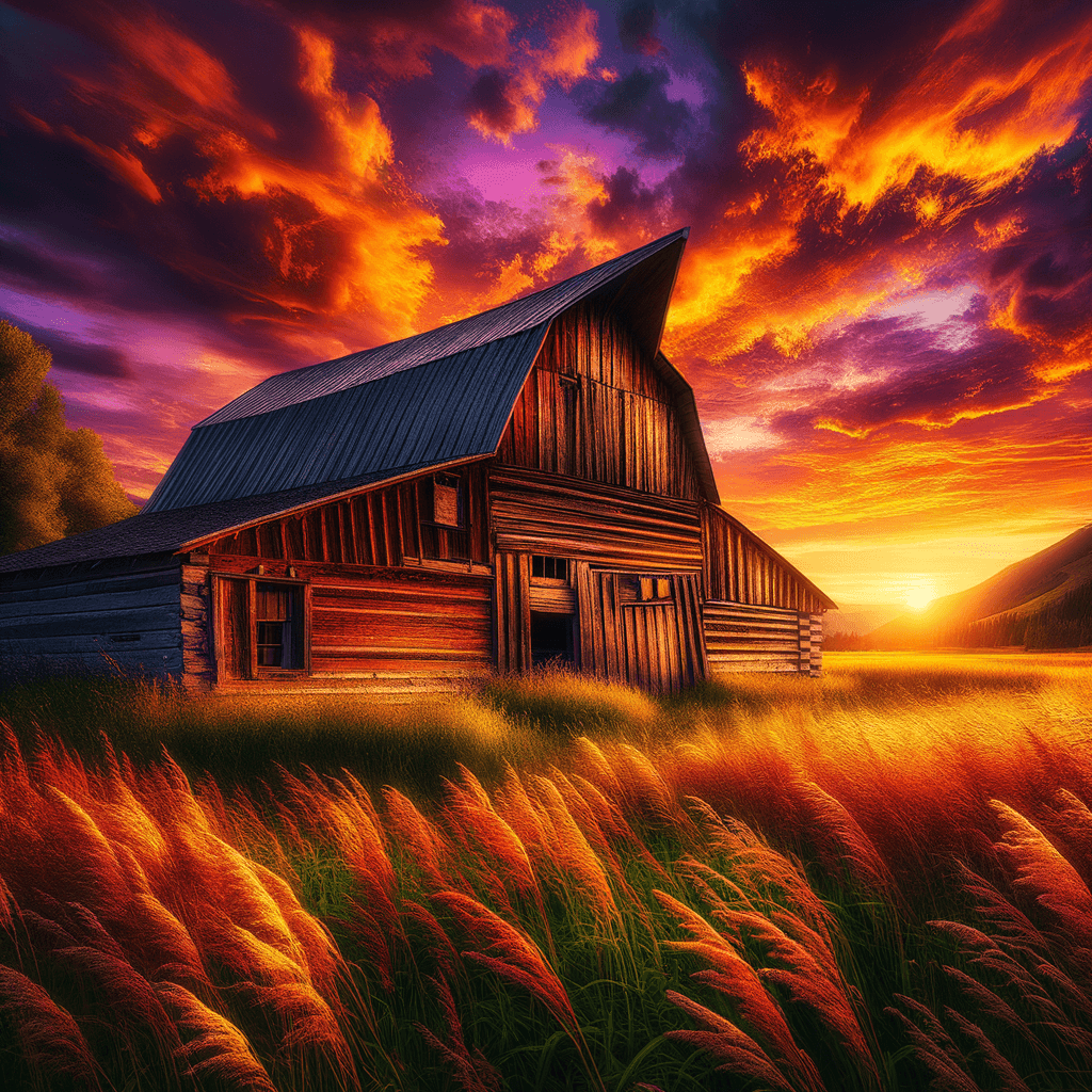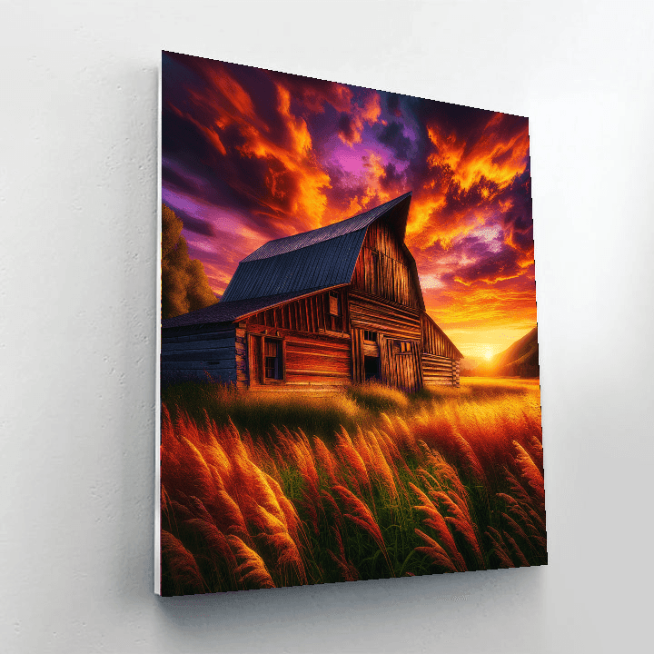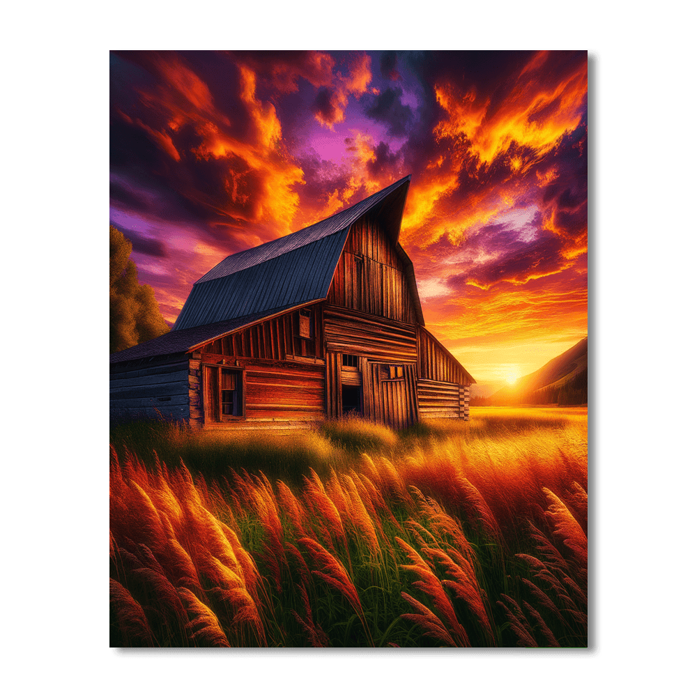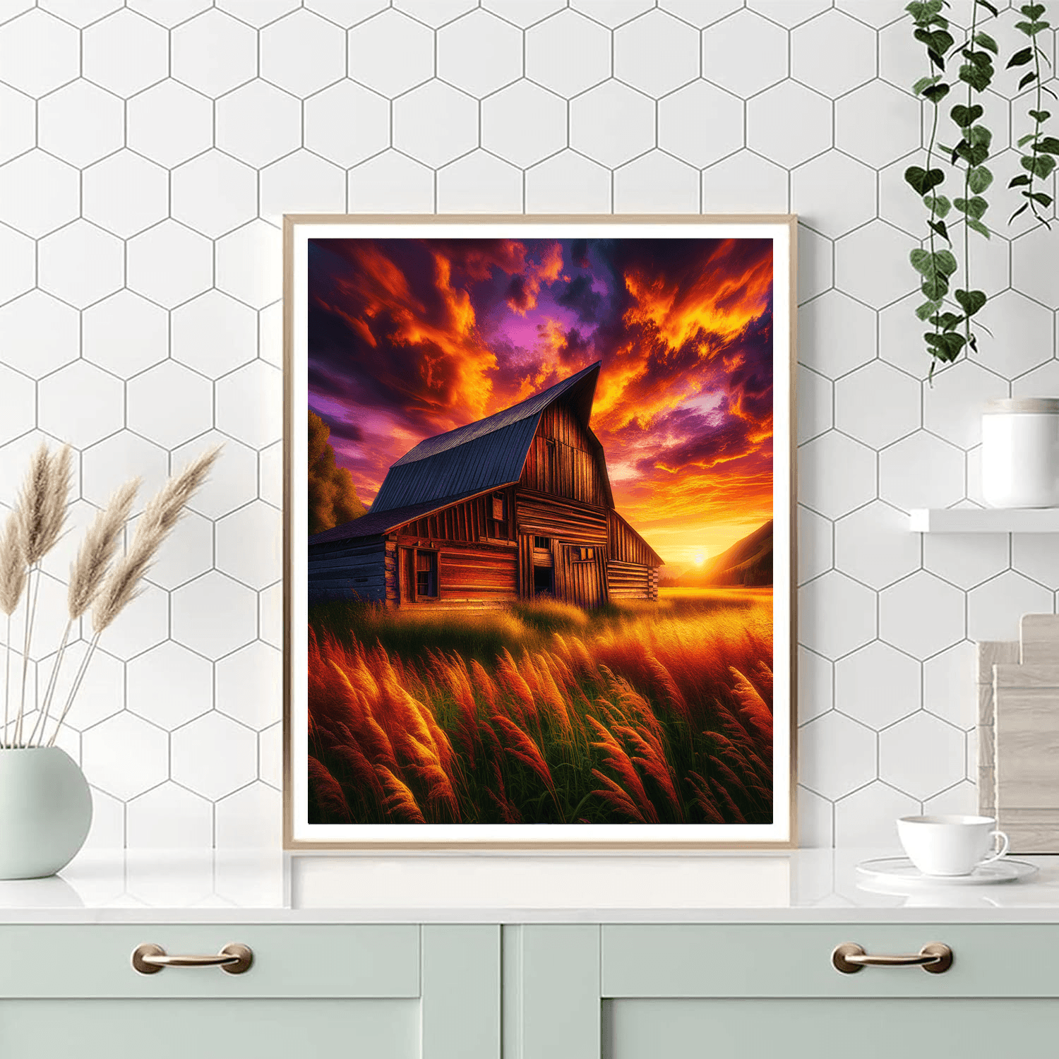 This product features a rustic barn set against the backdrop of a stunning sunset, offering a slice of rural life. The warm glow of the sun illuminates the barn and the surrounding fields, creating a peaceful, pastoral scene. This is perfect for those who appreciate country decor or want to bring a touch of rustic charm to their home. It would be particularly appealing in a living room, dining area, or any space where a rustic aesthetic is desired.