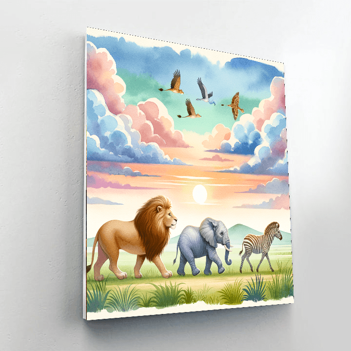 Join the Safari Animal Quest with this exciting set. This vibrant product features a group of safari animals, including a lion, elephant, and zebra, marching through the savannah. The scene is filled with energy and excitement, perfect for young animal enthusiasts. Ideal for a childs playroom or study area, this product encourages curiosity about wildlife and the natural world. The playful elements and bright colors make it a lively addition to any space.