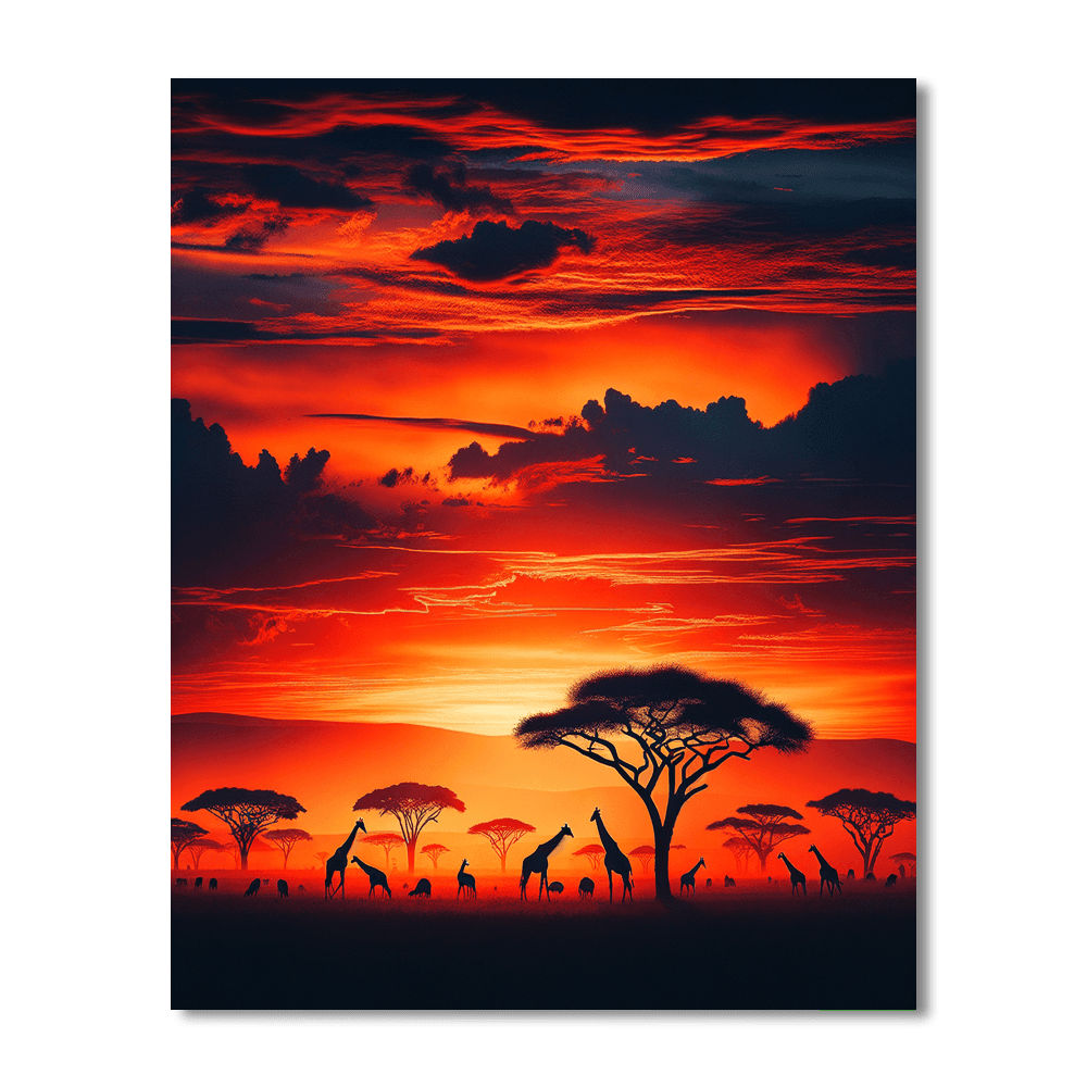 Safari Sunset captures the majestic beauty of the African savannah at sunset. The sky is ablaze with orange and red hues, casting a warm glow over the silhouettes of acacia trees and distant wildlife. This artwork is perfect for those who love wildlife and the raw beauty of nature. It can serve as a stunning focal point in living rooms, hallways, or offices, bringing a piece of the wild into urban spaces.