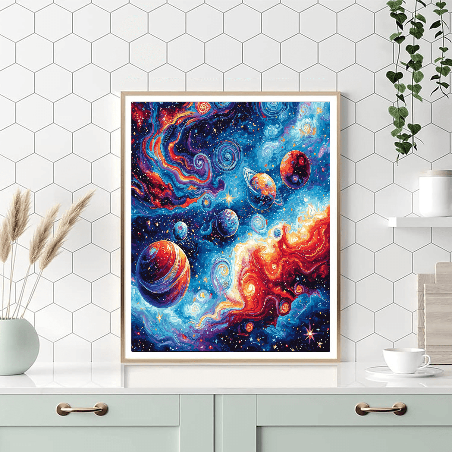 Embark on a surreal journey through space with this imaginative piece. This painting features a fantastical view of planets, stars, and cosmic phenomena, all rendered in a dreamlike, surrealist style. The vibrant colors and imaginative forms make it a captivating addition to any modern living room, studio, or office.