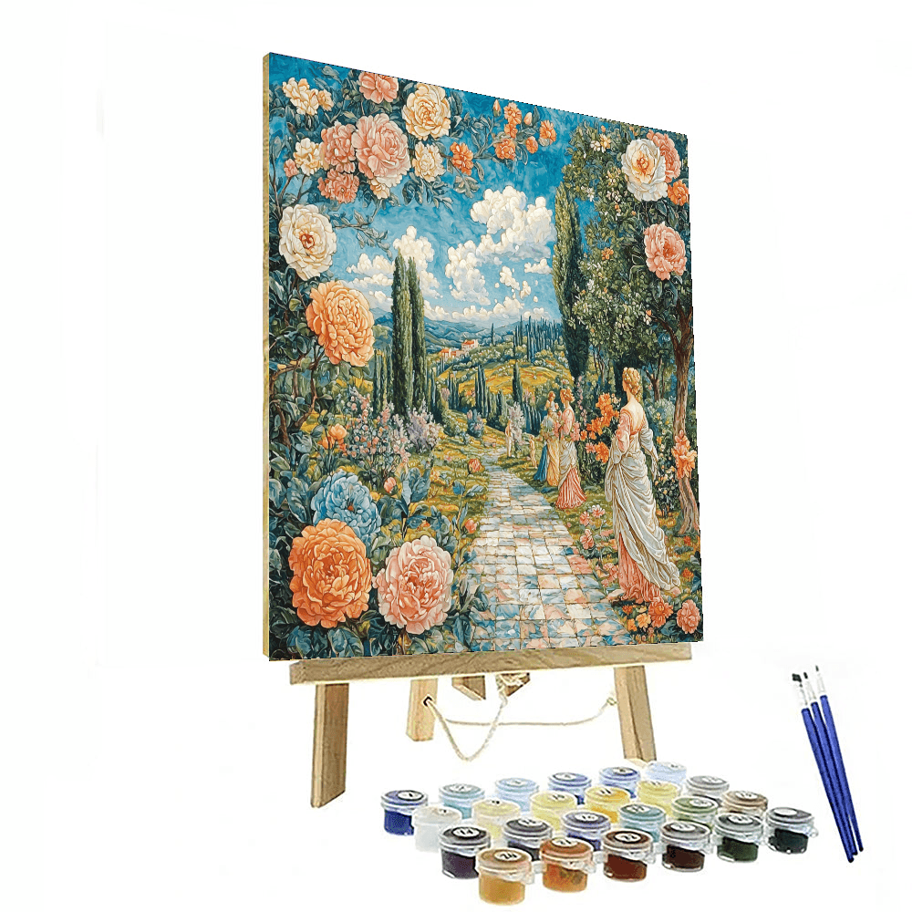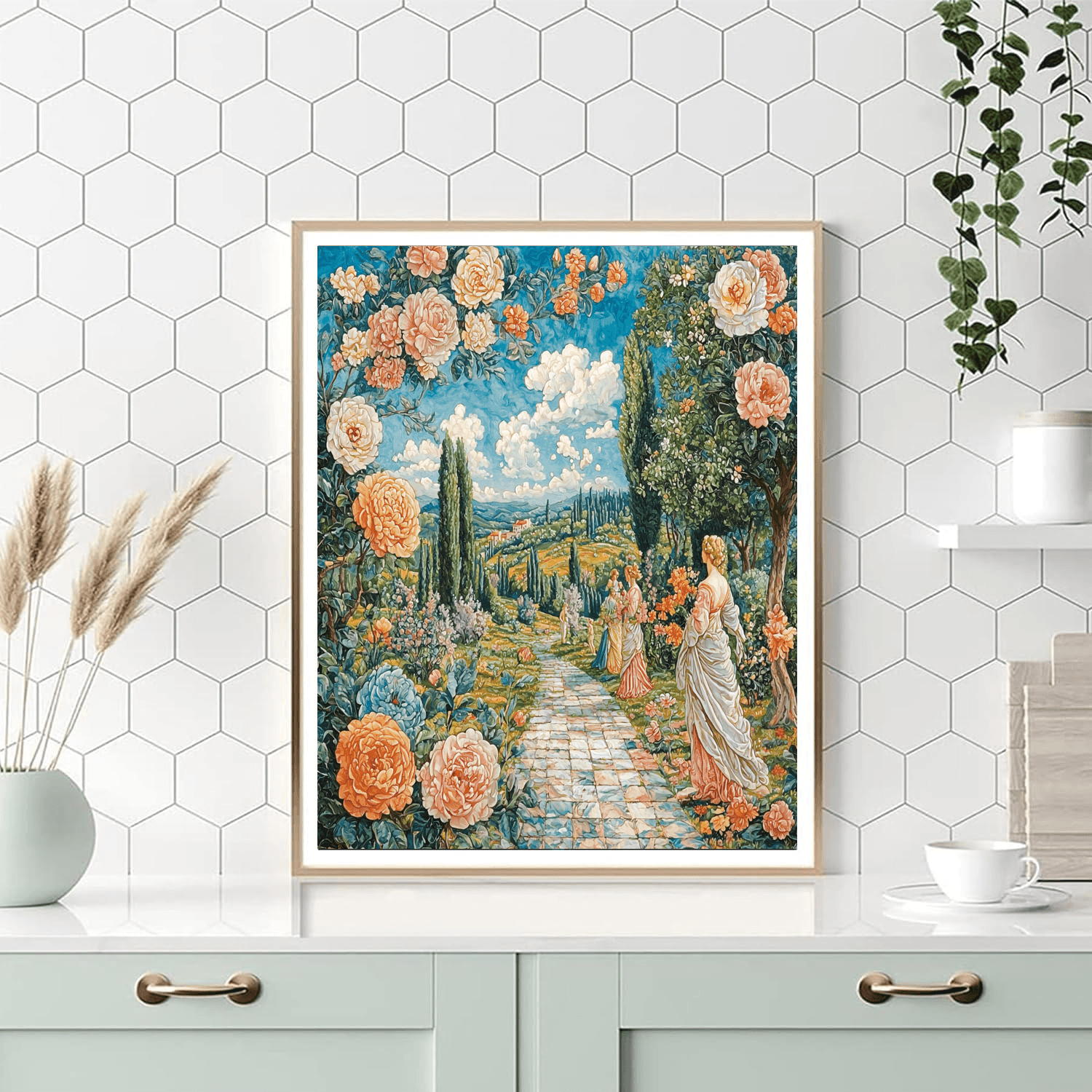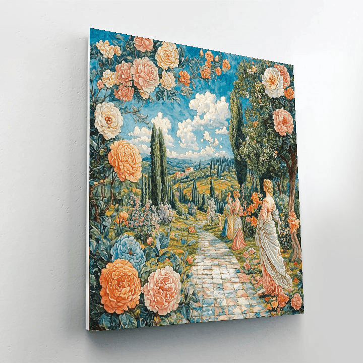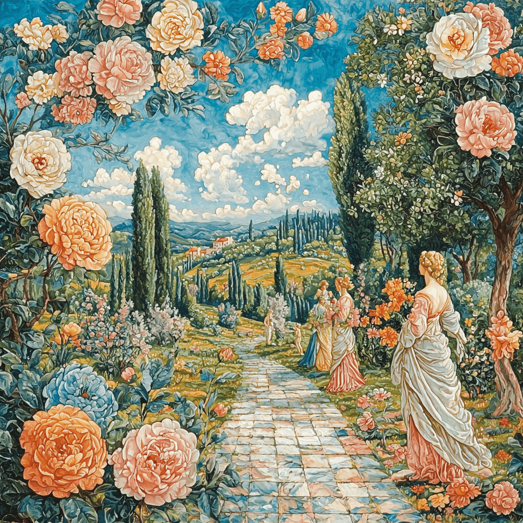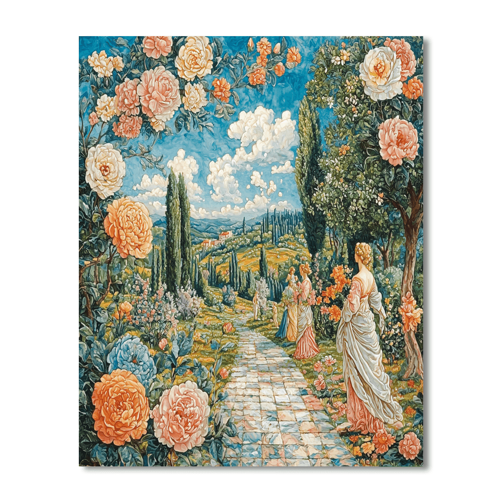 Inspired by Sandro Botticellis Renaissance style, Eternal Spring depicts a vibrant and flourishing garden that evokes a sense of renewal and joy. The detailed figures and floral motifs are reminiscent of Botticellis graceful compositions, making it an ideal piece for areas that celebrate beauty and growth, such as conservatories or garden rooms.