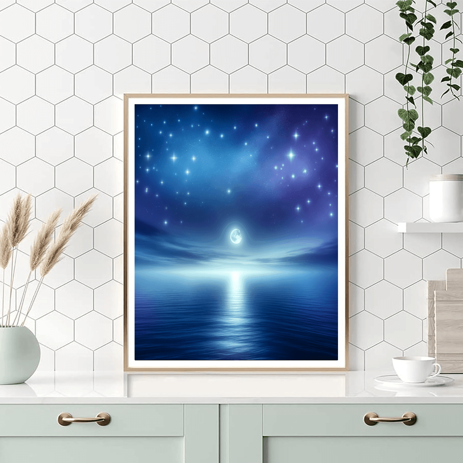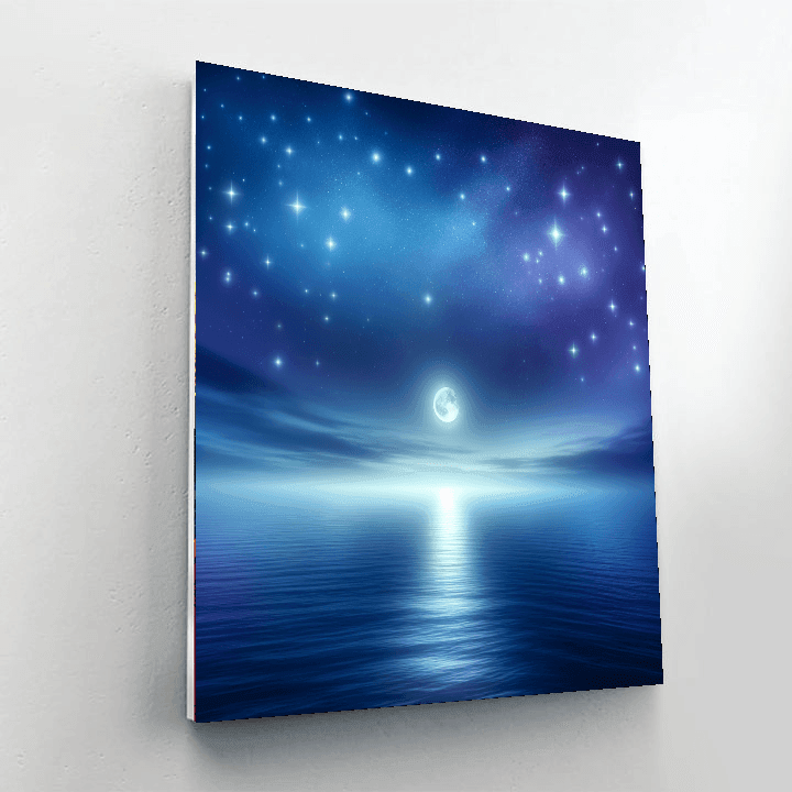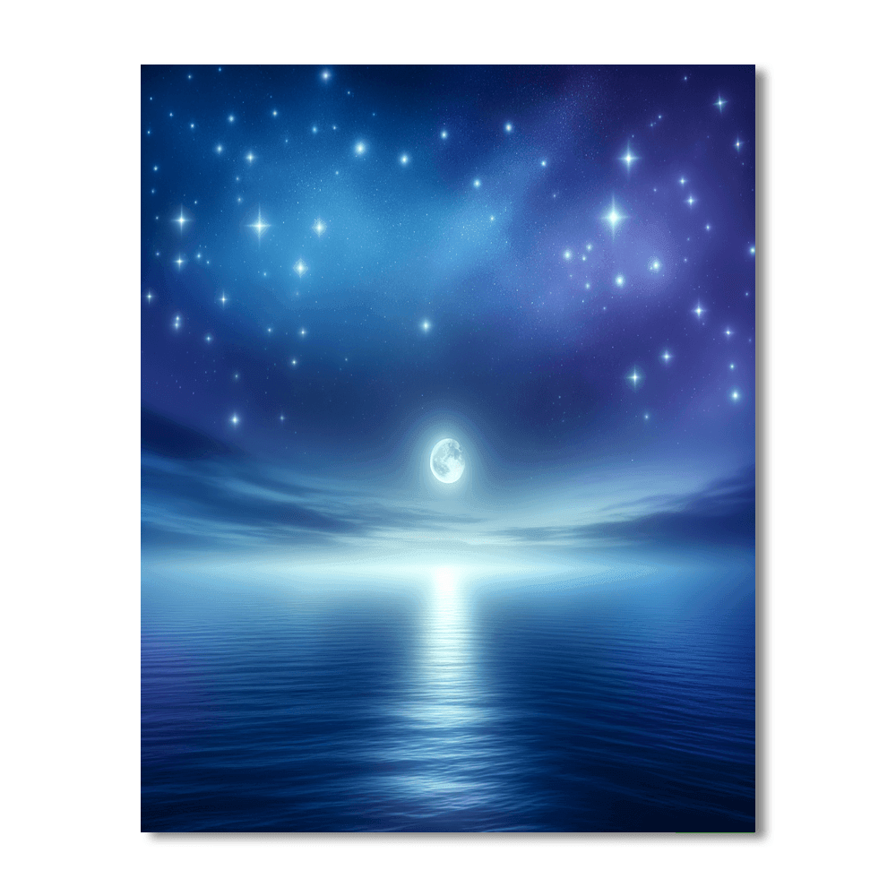 Sail into the Sapphire Starlight Seascape with this mesmerizing artwork. A tranquil seascape under a canopy of sapphire stars and a luminous moon invites you to embark on a journey of serenity and contemplation. Bring the beauty of the ocean into your home with this enchanting piece that soothes the soul.