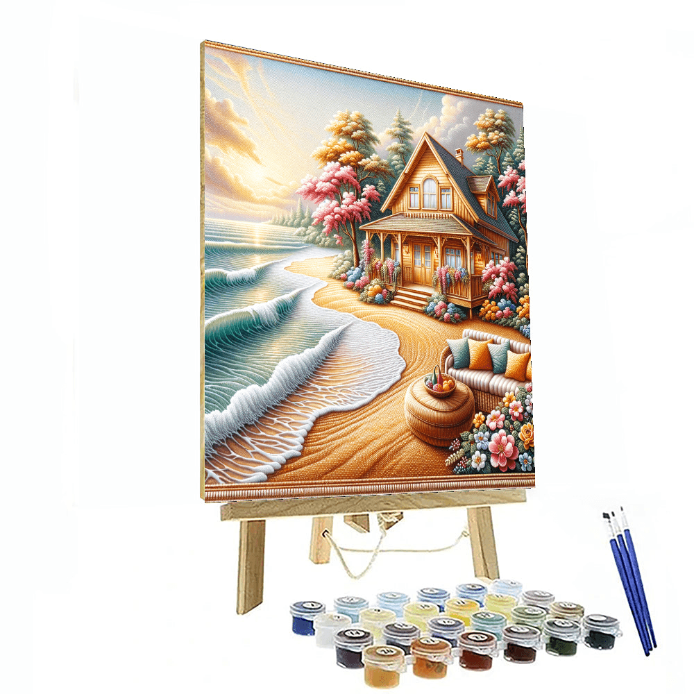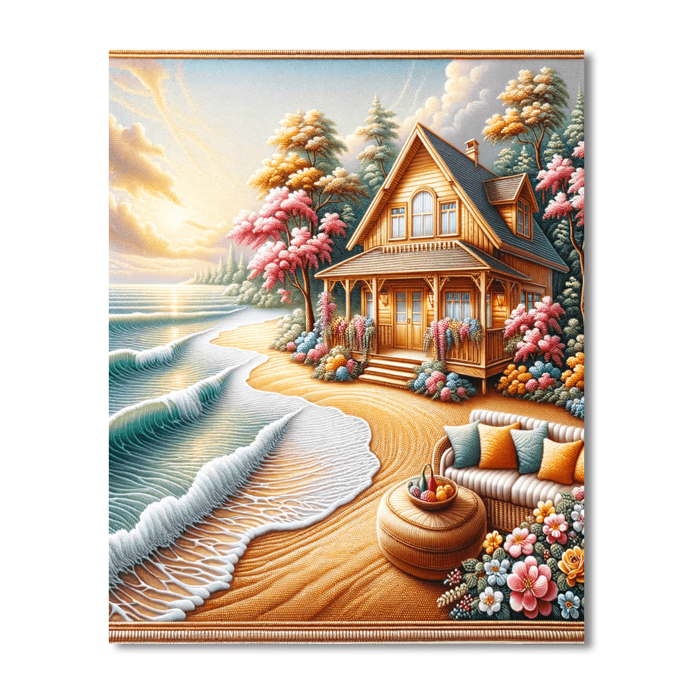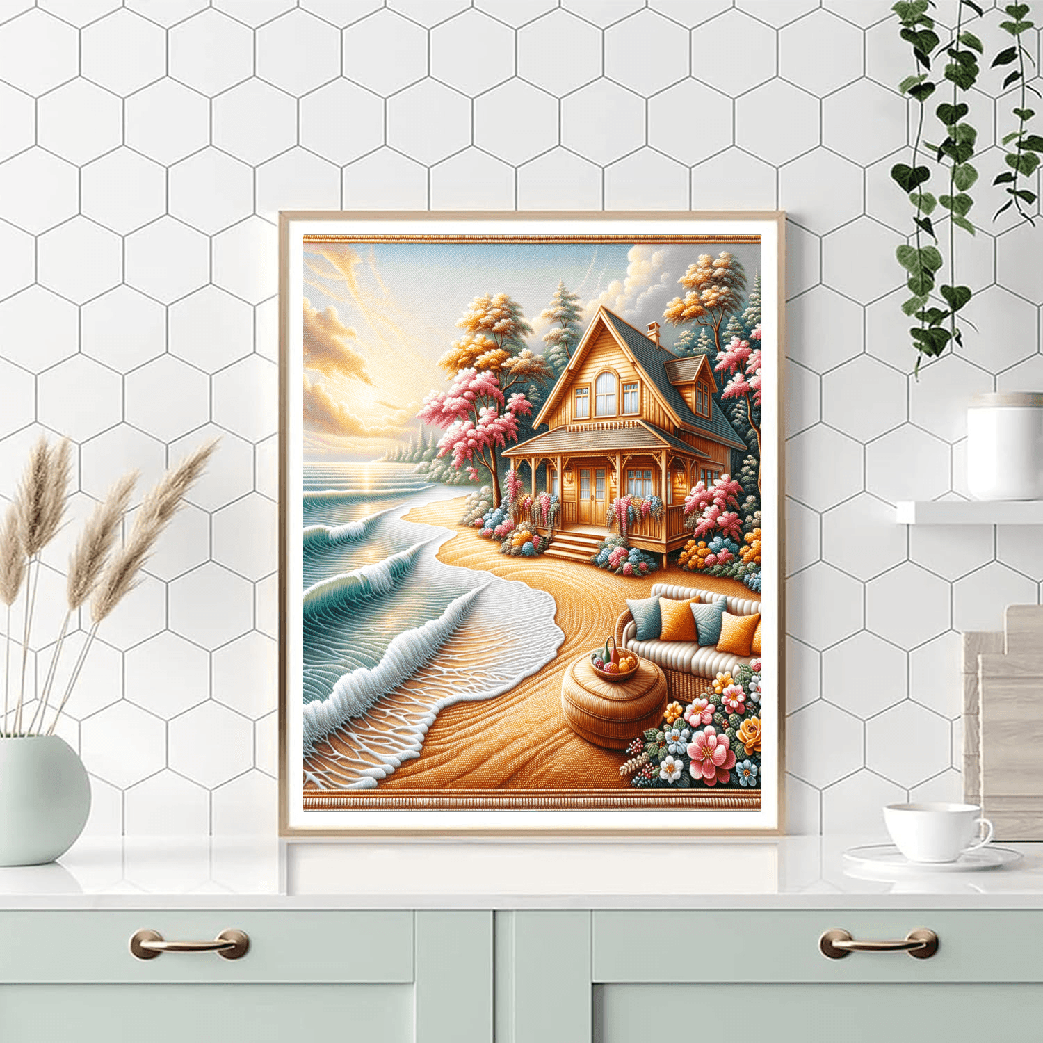 Escape to a charming seaside cottage with this delightful coastal scene. Featuring a quaint cottage, sandy beach, and gentle waves, this piece is perfect for bringing a touch of coastal charm to your bathroom or living room.