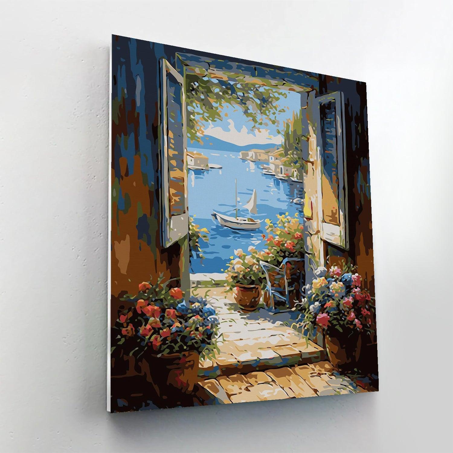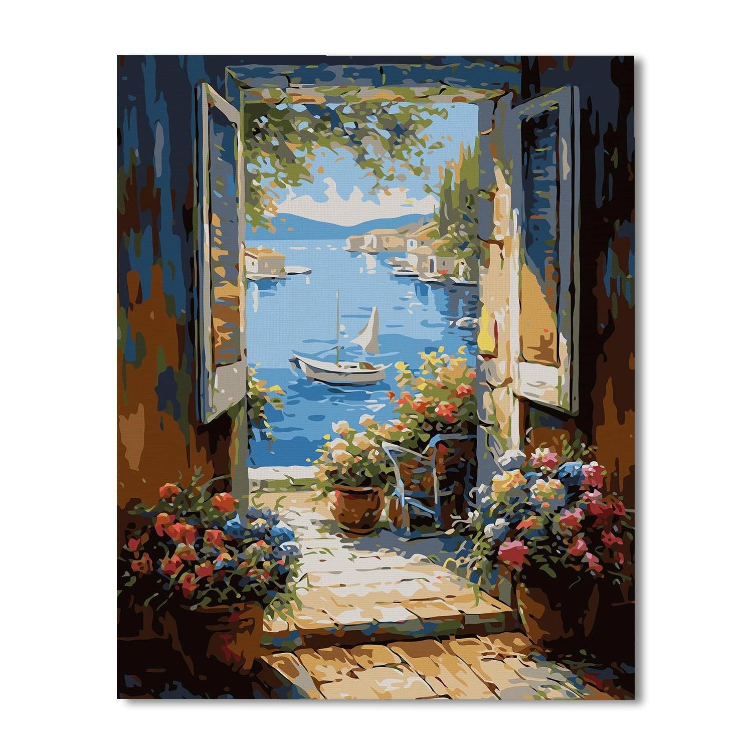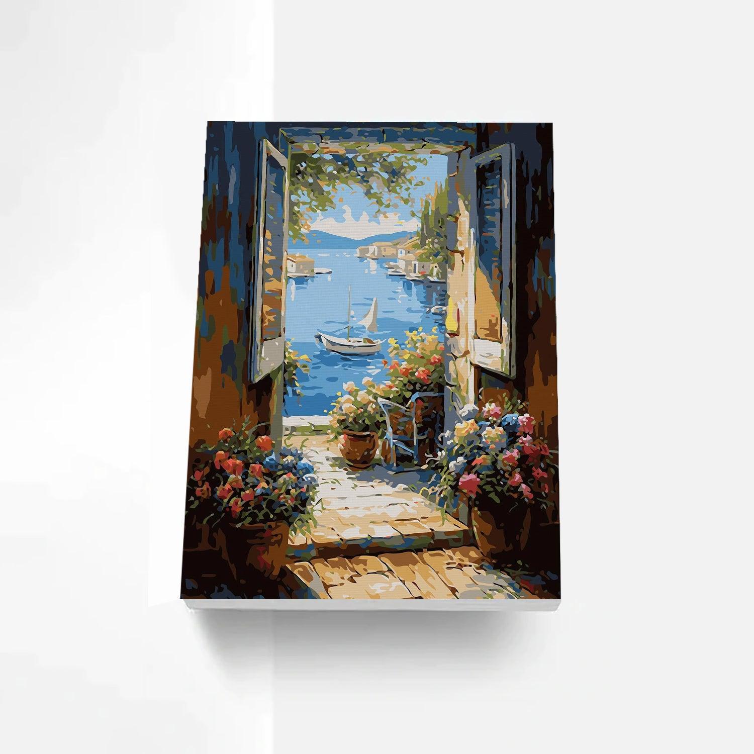 - Shape: The canvas has a vertical orientation, ideal for the portrayal of the picturesque doorway leading to the sea.