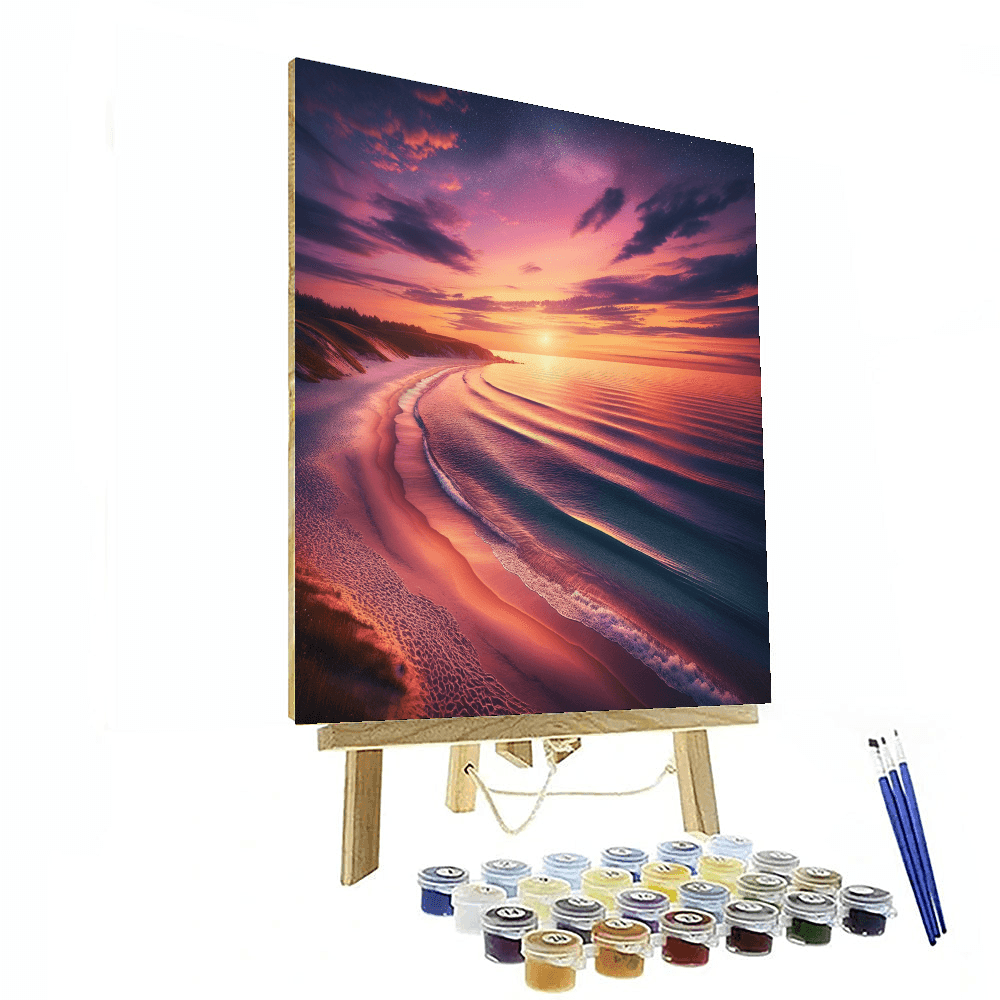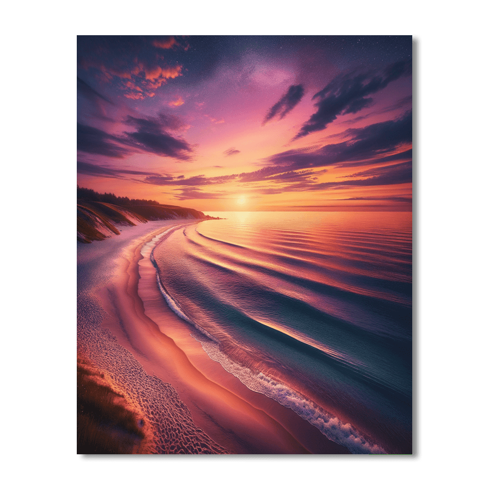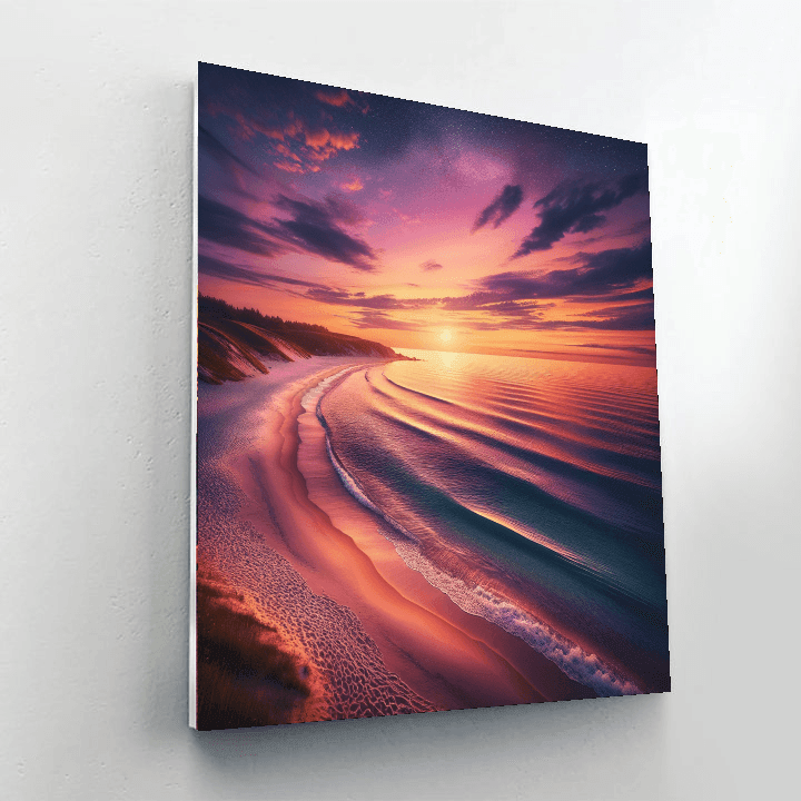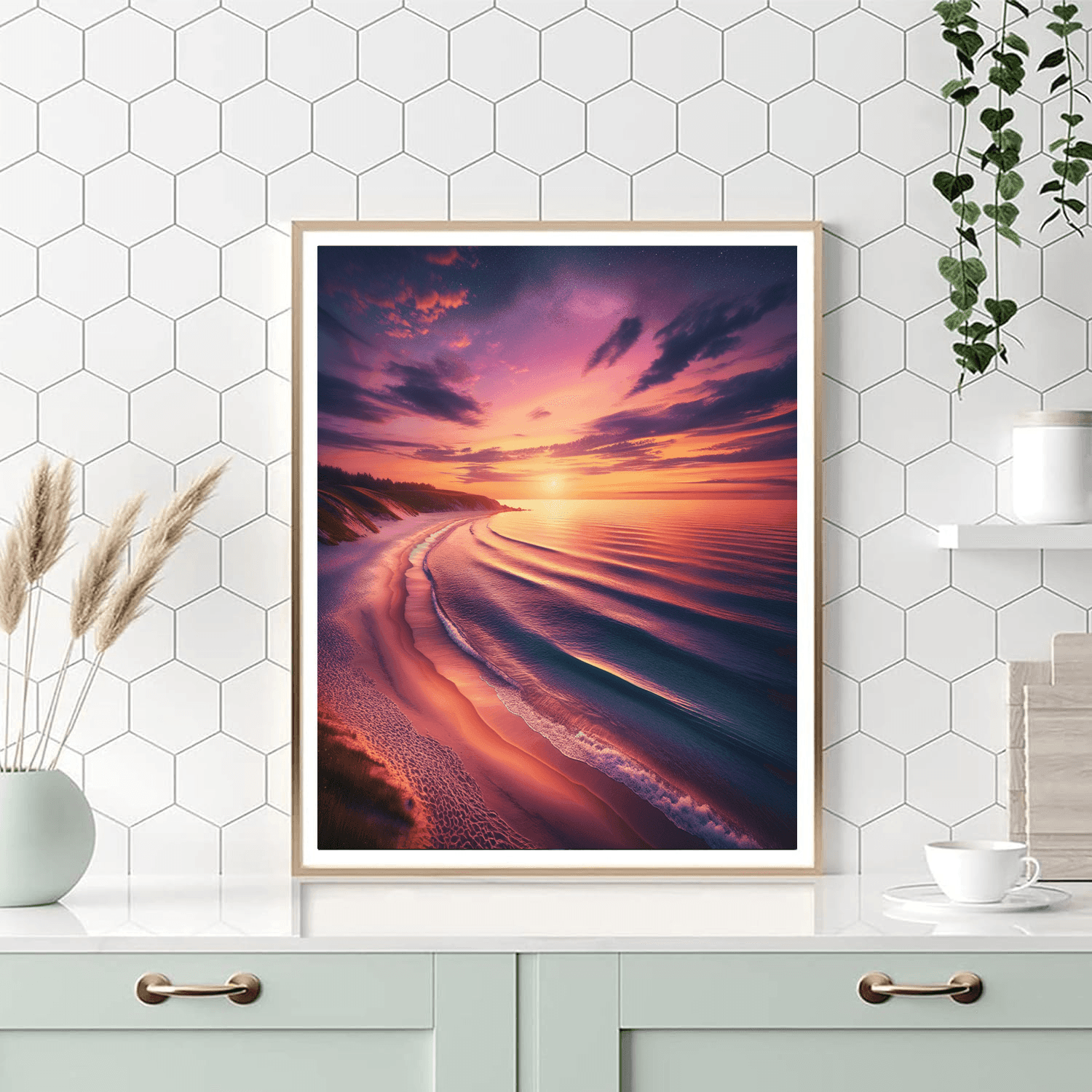 A tranquil coastal scene at sunset with gentle waves, sandy beaches, and a vibrant sky. Perfect for creating a calming atmosphere in a living room or bedroom.
