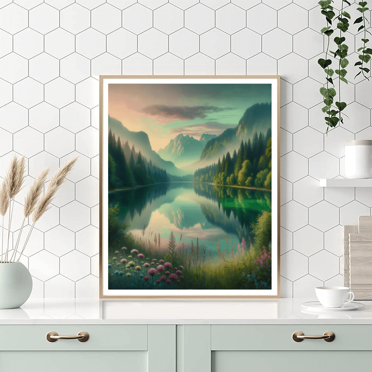 Experience the tranquility of nature with this serene lake scene, capturing the stillness of water reflecting the surrounding landscape. This artwork is perfect for a living room or meditation space, inviting calm and relaxation. The soothing colors and peaceful composition create an ideal environment for unwinding and reflecting.